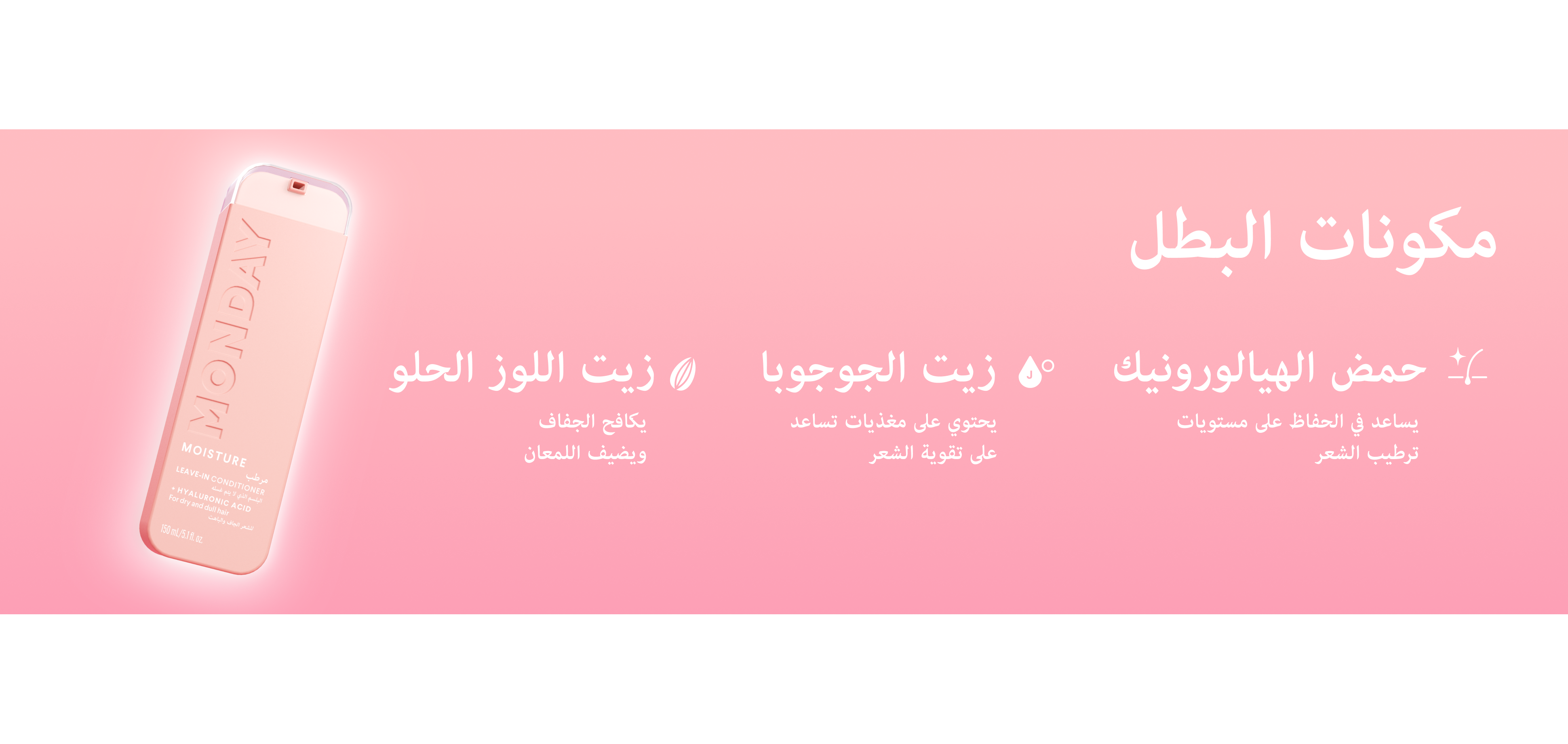 - بلسم مويستشر يترك على الشعر من مونداي للعناية بالشعر هو بلسم متعدد المهام يعزز الشعر ويزيد من صحته من خلال ترطيبه بعمق وحمايته من الحرارة والتكسر.