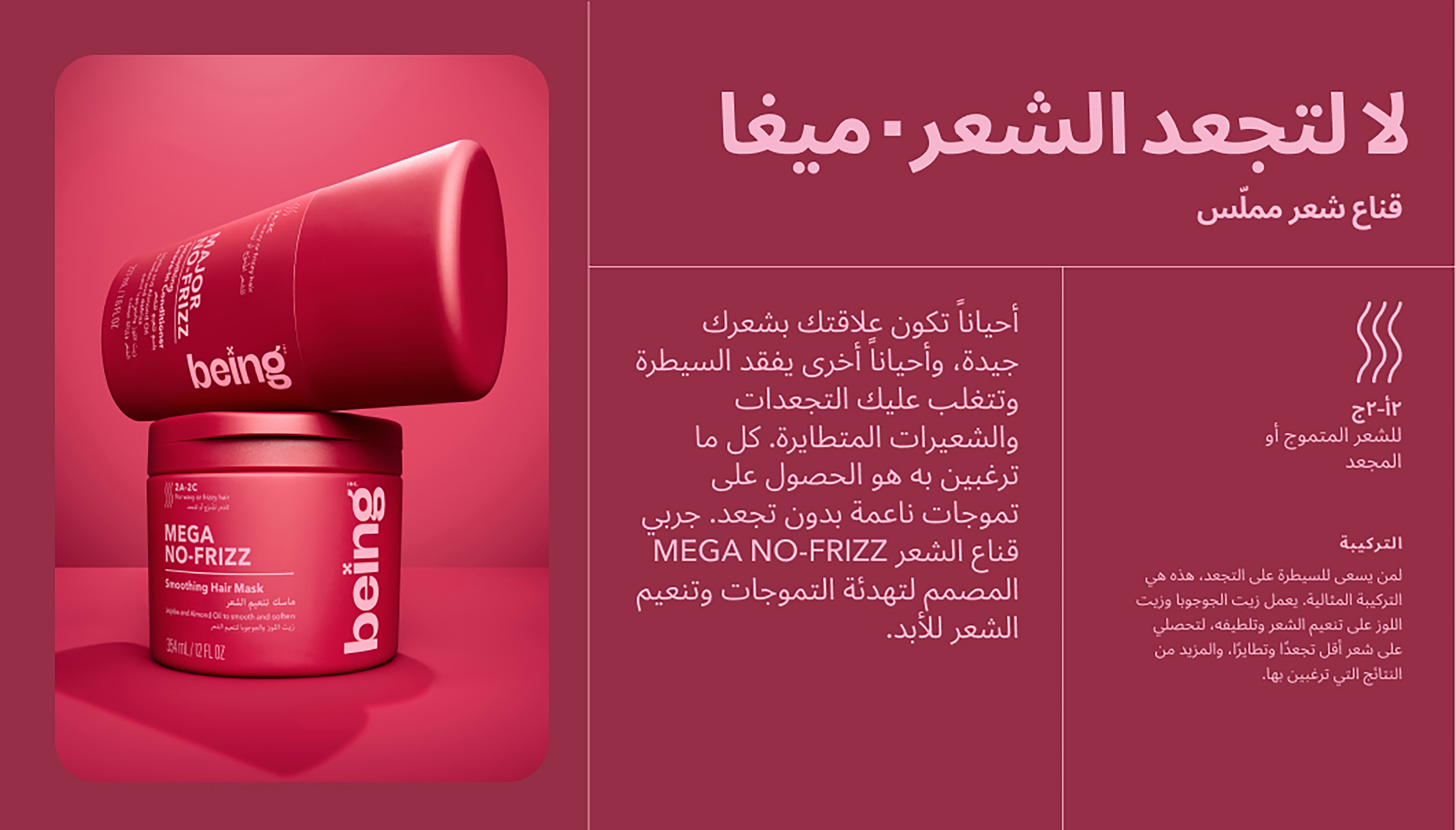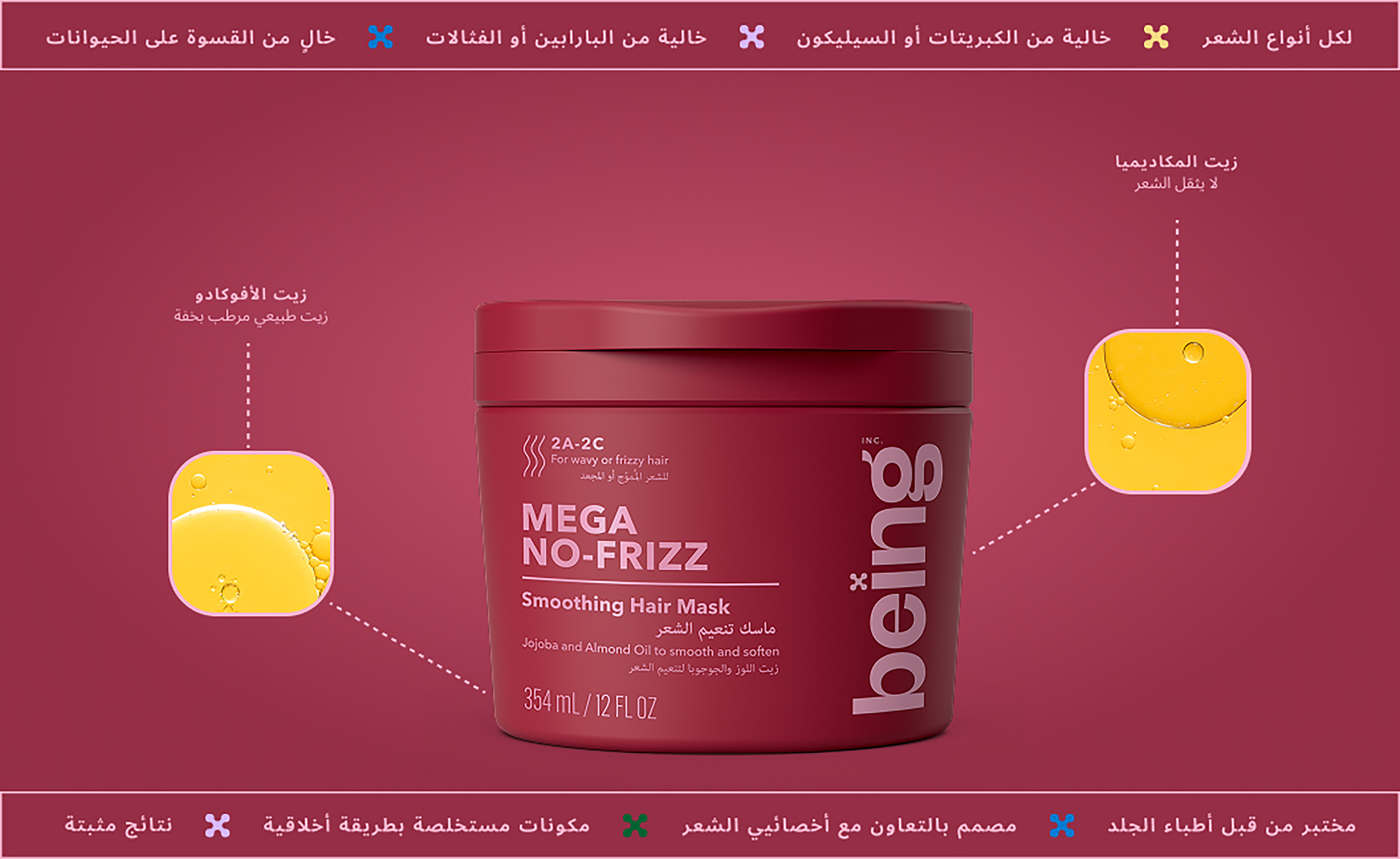 Being MEGA NO-FRIZZ قناع الشعر المملس يعمل على تليين وتنعيم الشعر المموج والمجعد، خاصة أنواع 2A-2C، باستخدام مكونات طبيعية مغذية. هذه التركيبة المختبرة من قبل أطباء الجلد، والخالية من الكبريتات والسيليكون، مثالية للاستخدام مرتين أسبوعيًا كعلاج، أو كبديل للبلسم للشعر الذي يكون جافًا جدًا و/أو مجعدًا. تساعد زيوت الجوجوبا واللوز الطبيعية المستخلصة على استعادة نعومة ولمعان الشعر، مما يتركه ناعمًا وخاليًا من التجعد.