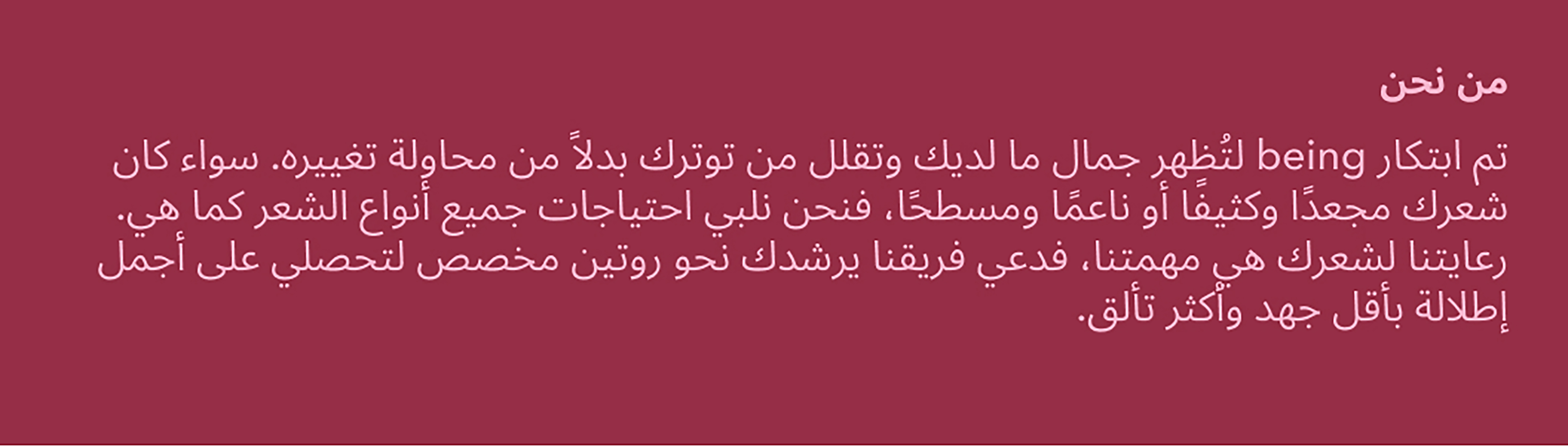 Being هي علامة للعناية بالشعر يقودها المجتمع، تم إنشاؤها لتلبية جميع أنواع الشعر كما هي تمامًا. تعمل المجموعة على تحسين وتخفيف التوتر في شعرك كما هو، بدلًا من محاولة تغييره إلى شيء آخر. سواء كان شعرك مجعدًا وخشنًا أو ناعمًا ومسطحًا، تساعدك على اكتشاف شعر يعكس شخصيتك الحقيقية — مع جهد أقل ووجود أكثر.