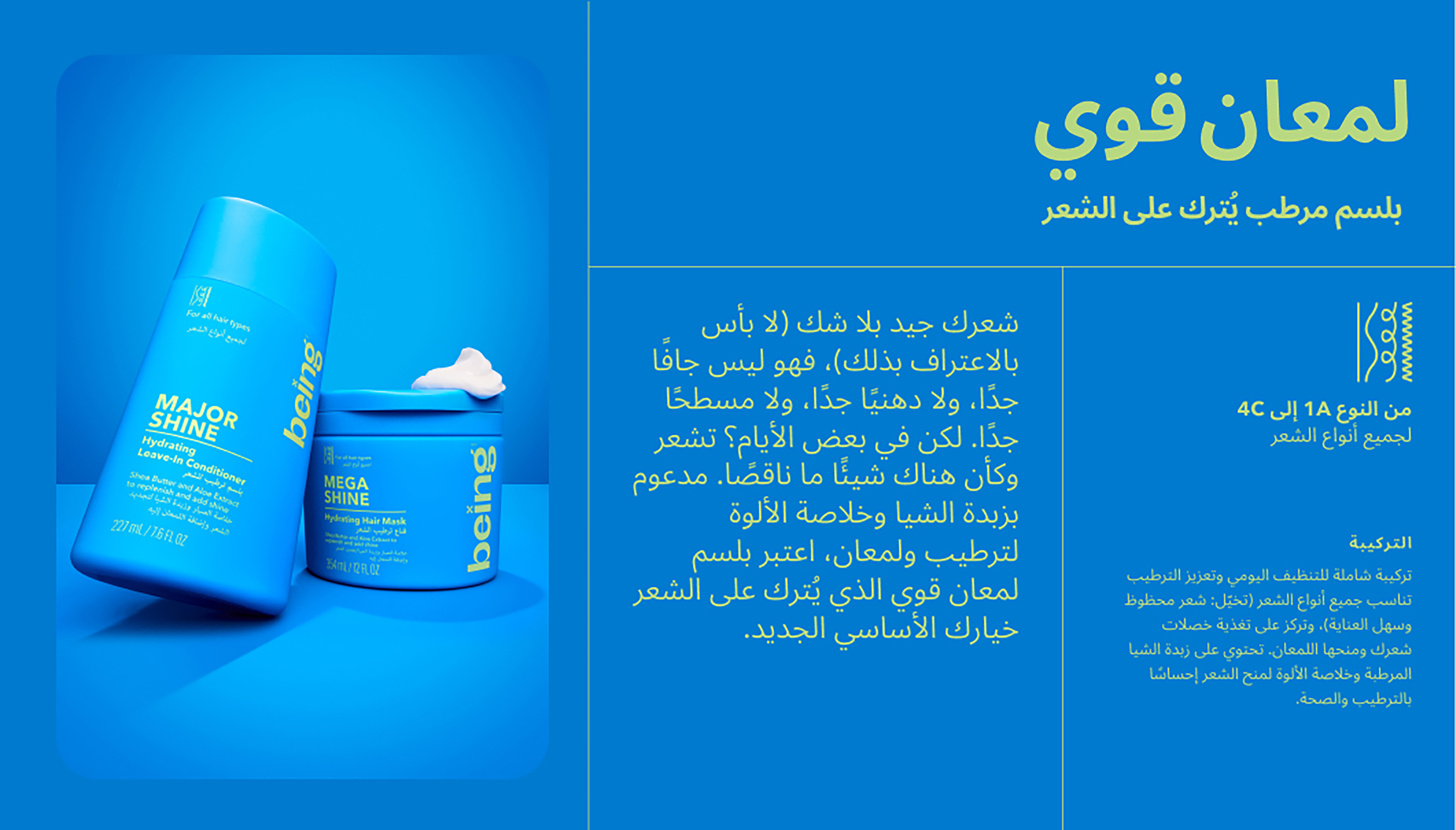 Being هي علامة للعناية بالشعر يقودها المجتمع، تم إنشاؤها لتلبية جميع أنواع الشعر تمامًا كما هي. تعمل المجموعة على تحسين وتخفيف التوتر في شعرك كما هو، بدلاً من محاولة تغييره إلى شيء آخر. سواء كان شعرك مجعدًا وخشنًا أو ناعمًا ومسطحًا، تساعدك على اكتشاف شعر يعكس شخصيتك الحقيقية — مع جهد أقل ووجود أكثر.