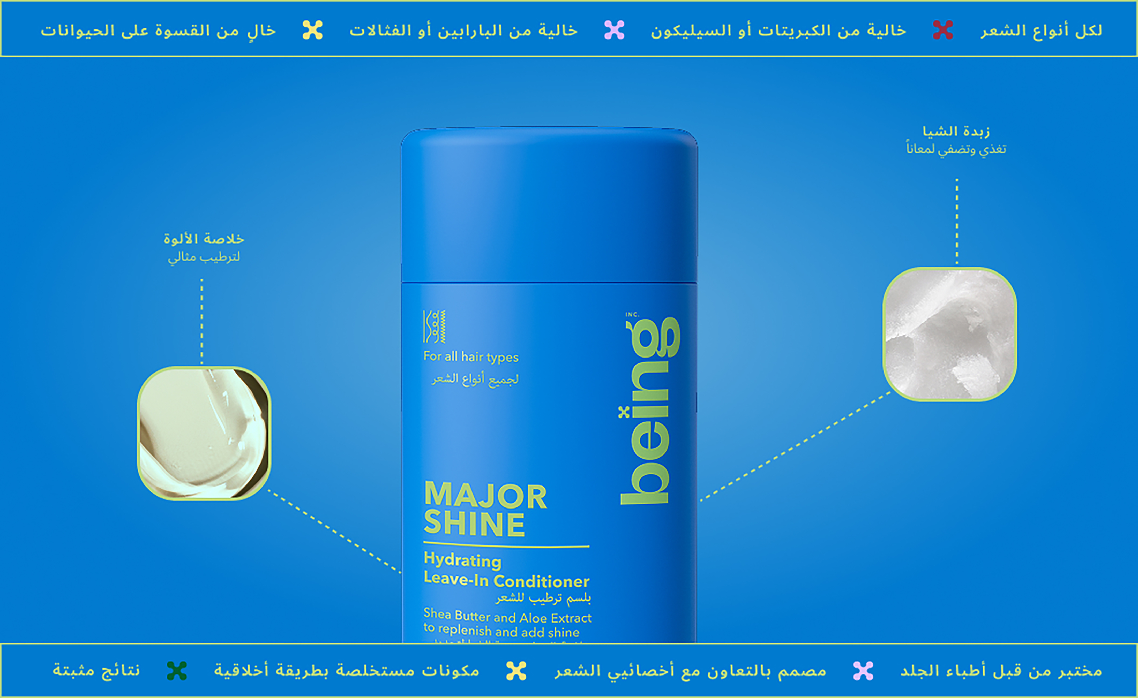 Being MAJOR SHINE بلسم الترطيب بدون شطف مُصمم لأنواع الشعر التي تحتاج إلى المزيد من الرطوبة واللمعان. تركيبة مختبرة من قبل أطباء الجلد، خالية من الكبريتات والسيليكون، ومثالية للاستخدام بعد الغسل، حيث تُطبق على الأطراف للمساعدة في التصفيف الطبيعي، أو يمكن استخدامها كحماية من الحرارة. تحتوي على مكونات طبيعية مشتقة مثل زبدة الشيا ومستخلص الألوة لدعم صحة الشعر، مما يتركه ناعمًا ولامعًا بأفضل شكل.