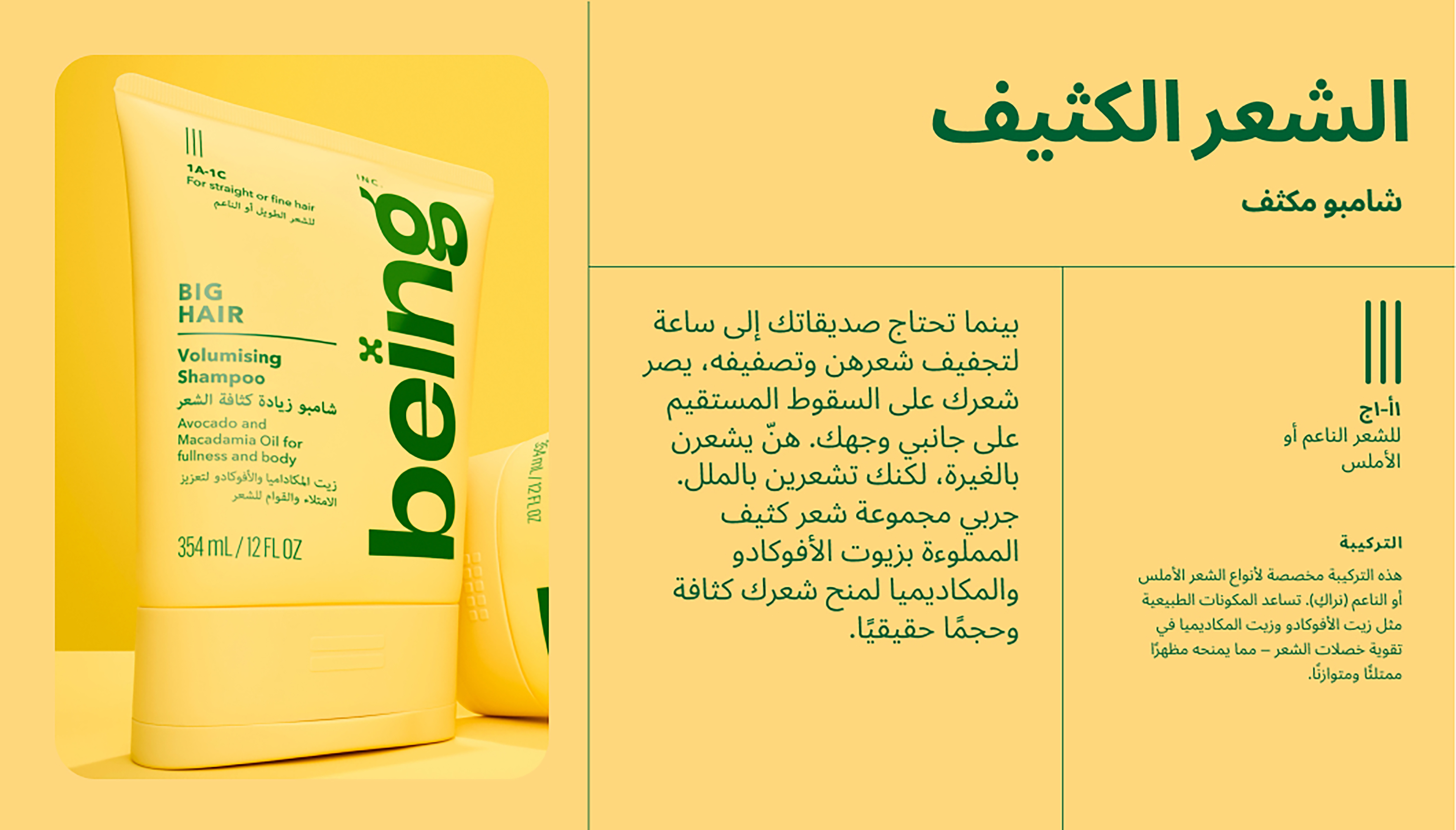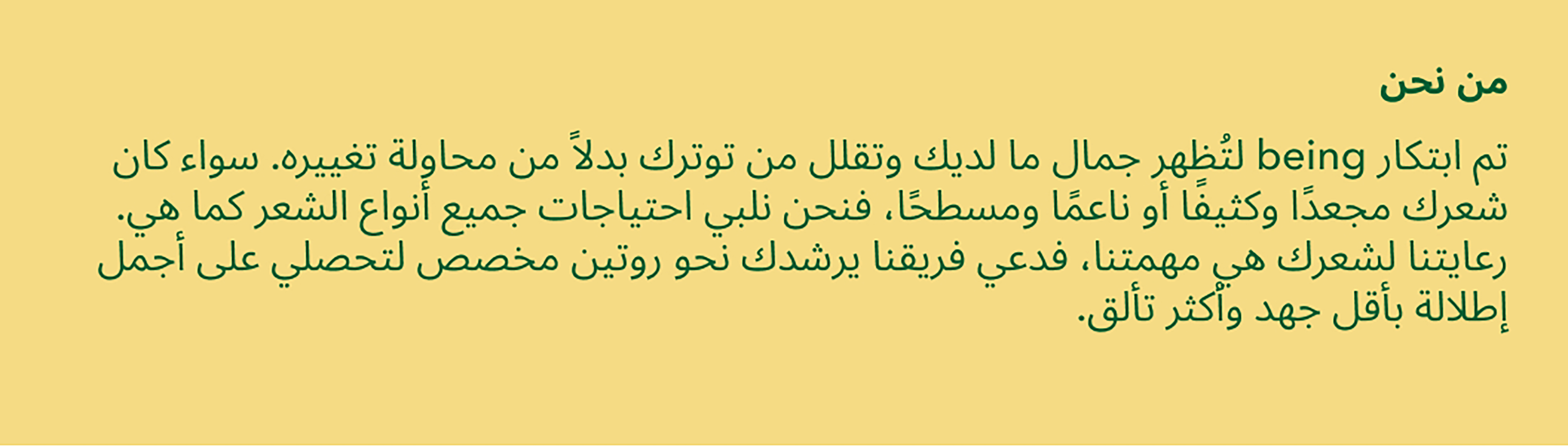 براند Being هو علامة للعناية بالشعر تقودها المجتمع، مصممة لتلبية جميع أنواع الشعر تمامًا كما هي. تعمل المجموعة على تحسين وتخفيف التوتر في شعرك كما هو، بدلاً من محاولة تغييره إلى شيء ليس عليه. سواء كان شعرك مجعدًا وخشنًا أو ناعمًا ومسطحًا، تساعدك هذه المنتجات على اكتشاف شعر يعكس شخصيتك الحقيقية — مع جهد أقل ووجود أكثر.