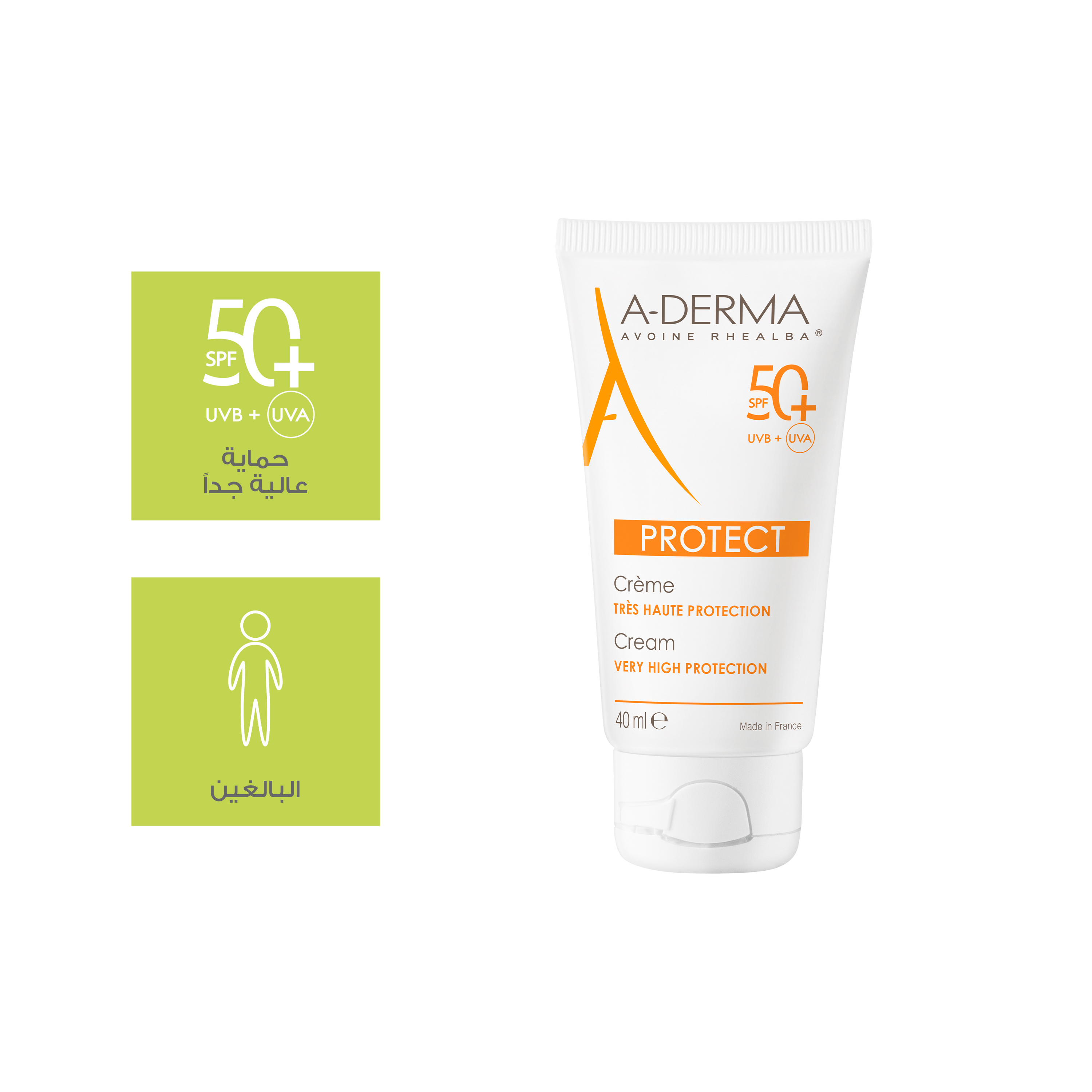يوفر A-DERMA Protect Sunscreen Cream SPF 50+ 40ml حماية عالية جدًا من أشعة الشمس الضارة UVA وUVB، مع عناية متكاملة للبشرة الحساسة والضعيفة. يتميز بتركيبة خالية من العطور تساعد على تقوية الحاجز الطبيعي للبشرة وحمايتها من أضرار الشمس. كما تمنح تركيبته الكريمية ترطيبًا وراحة طويلة الأمد، لتبقى البشرة ناعمة ومحميّة أثناء التعرض للشمس.