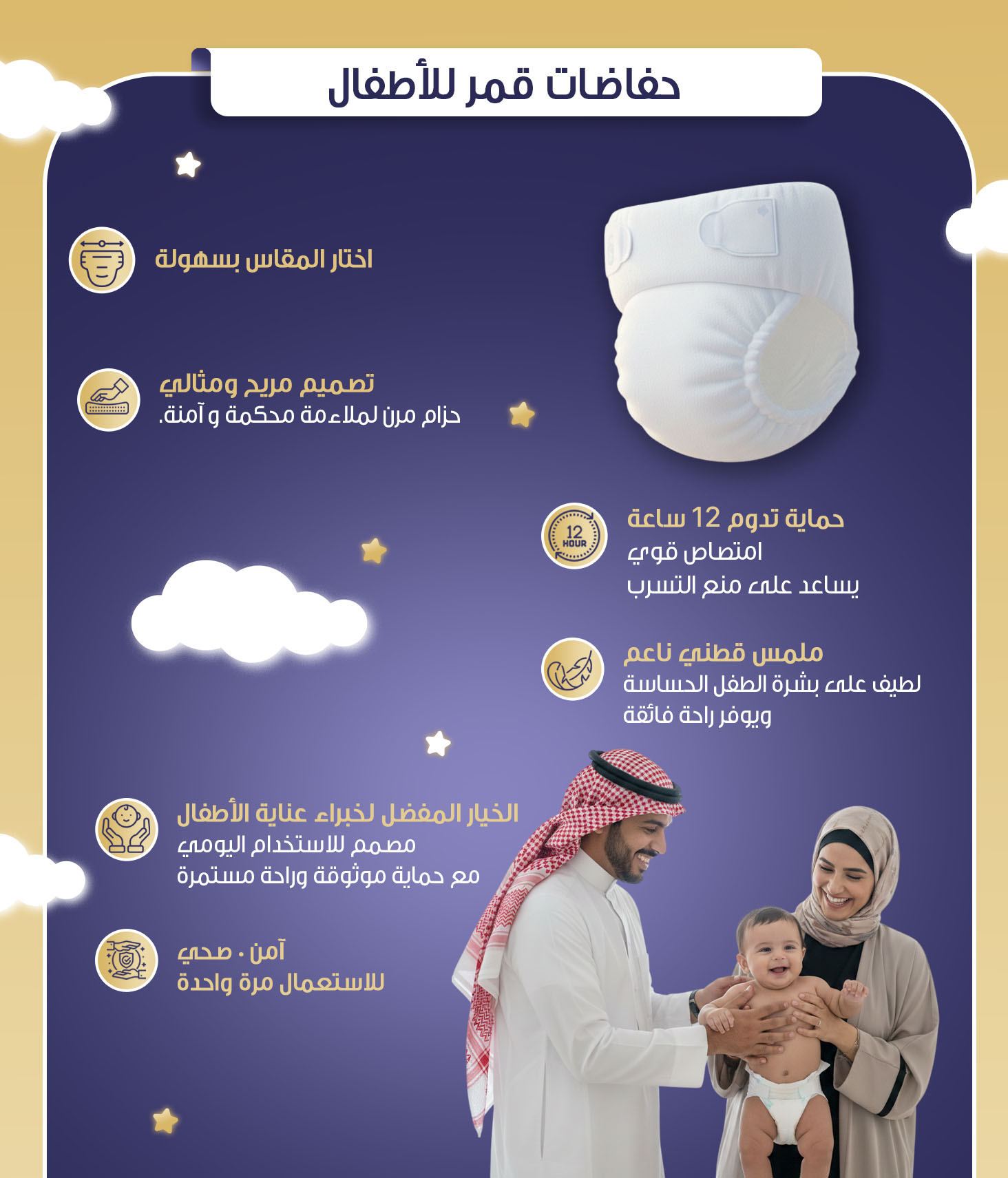 - تحمي الحفاضات ذات الملمس القطني الناعم بشرة طفلك الرقيقة وتحافظ على نعومتها وجفافها لأكثر من 12 ساعة في اليوم.