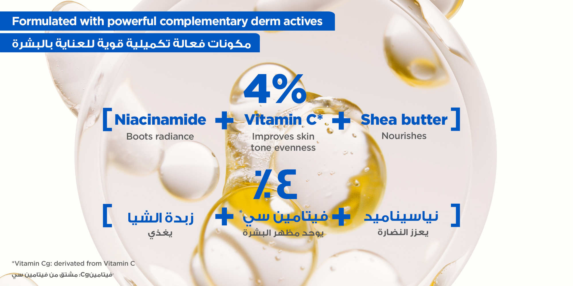 - يحتوي على 4٪ نياسيناميد لتقليل البقع الداكنة، وفيتامين سي لتوحيد لون البشرة، وزبدة الشيا لتغذية البشرة.