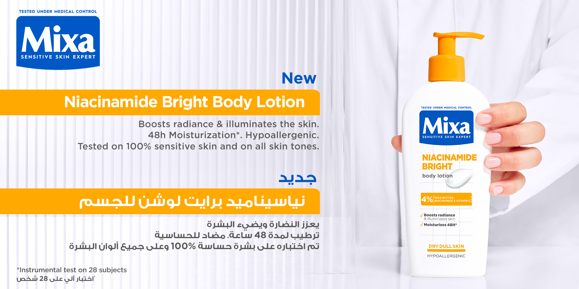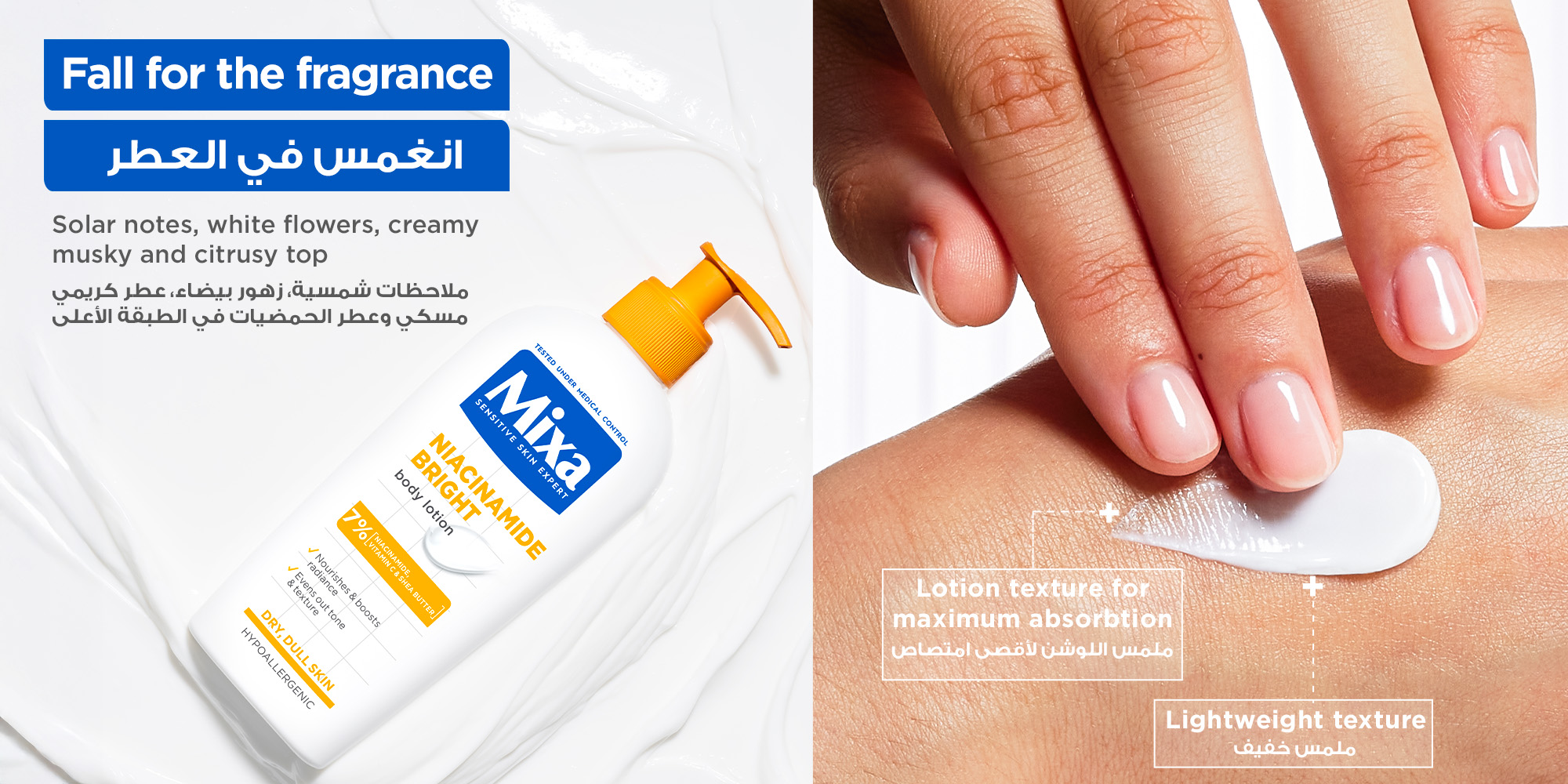 - لوشن الجسم ميكسا نياسيناميد برايت 250 مل هو مرطب يومي لطيف للبشرة الجافة والباهتة وغير المتجانسة اللون. غني بنسبة 4٪ من زبدة الشيا، النياسيناميد، وفيتامين Cg، يمنح ترطيبًا يدوم حتى 48 ساعة مع تفتيح لون البشرة وتوحيده بشكل واضح.