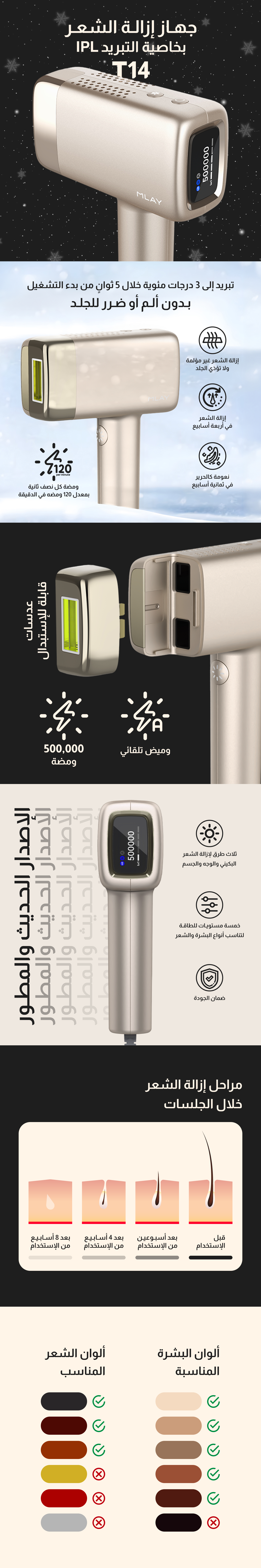 - 【نتائج أسرع خلال 3 أسابيع】: يتميز جهاز إزالة الشعر بالليزر T14 بأنّه يلبي معايير السلامة الطبية الدولية ومعتمد من إدارة الغذاء والدواء. تكون درجة الحرارة عند ملامستها للجلد حوالي 3 درجات مئوية فقط وطاقة أعلى 16.77 جول. (ملاحظة: تذكر استخدام 1-2 مرات في الشهر بعد الأسبوع الثالث للحصول على نتائج دائمة)