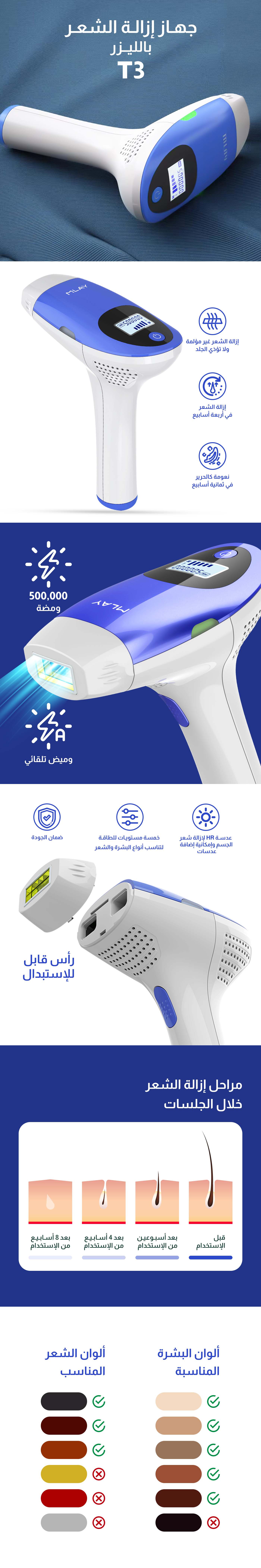 • تقنية آمنة وفعالة: يعتمد جهاز ليزر ملاي T3 على تقنية ليزر متطورة توفر نتائج ممتازة دون المساس بسلامة البشرة.