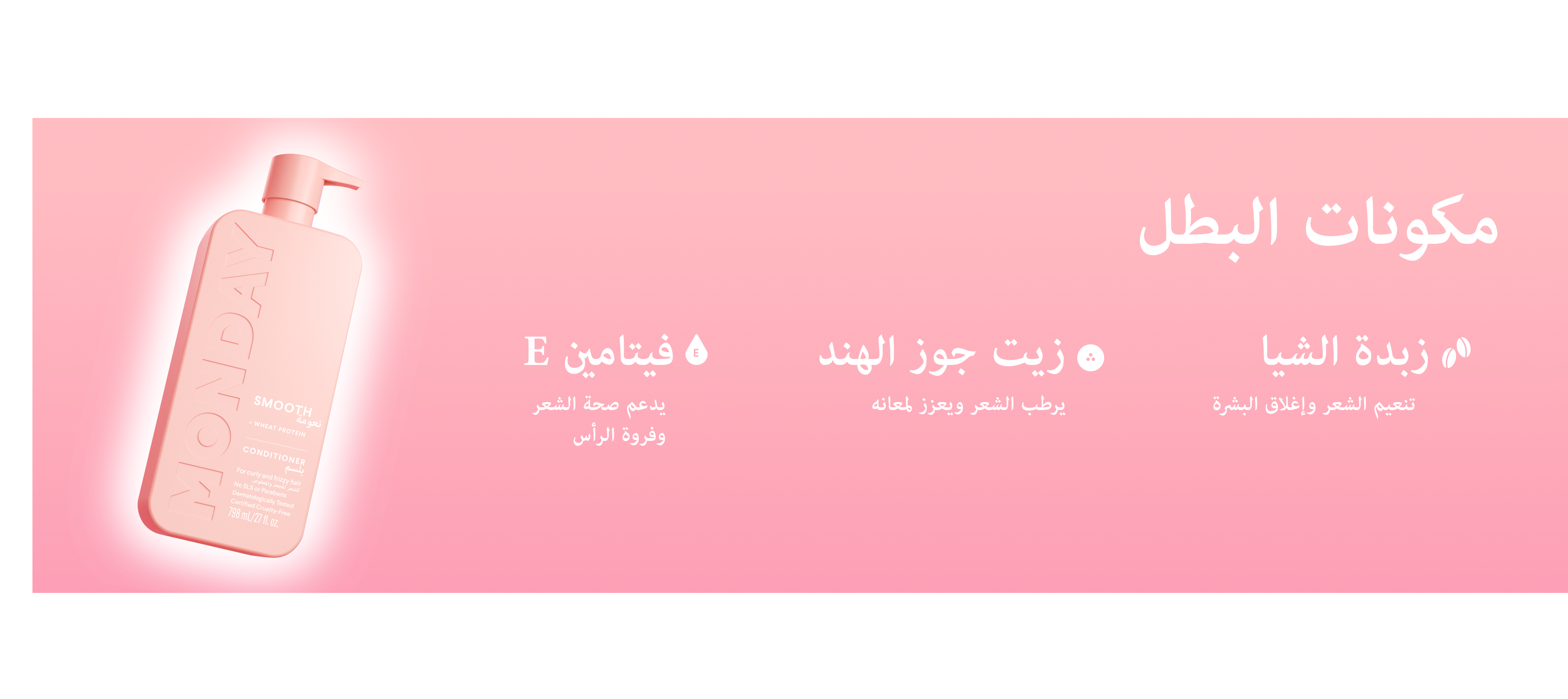 - بلسم مرطب من MONDAY Haircare الحائز على جوائز يحتوي على مكونات فعّالة مثل حمض الهيالورونيك ومكونات طبيعية لطيفة مثل زبدة الشيا، ليمنح الشعر الجاف والباهت دفعة من الترطيب ويتركه مغذى ومنتعشاً.