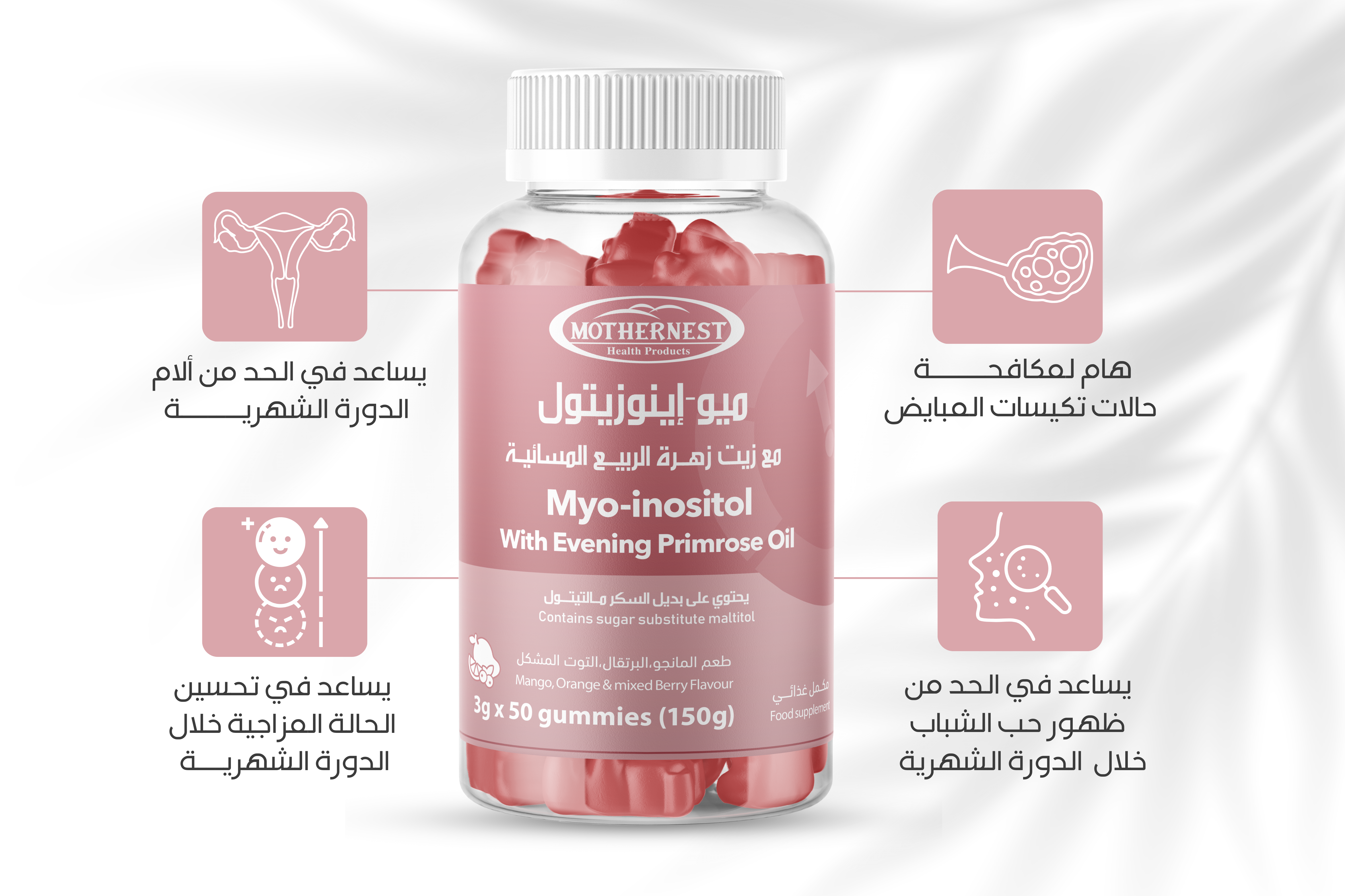 - مذرنيست ميوإزينوتول وزهرة الربيع المسائية مزيج فريد وطريقه مبتكره للجمع بين فوائد ميوإزينوتول وزهرة الربيع المسائية والخصائص الطبية لهما على شكل حلوى بدون اضافة سكر او الوان صناعية او مواد حافظة