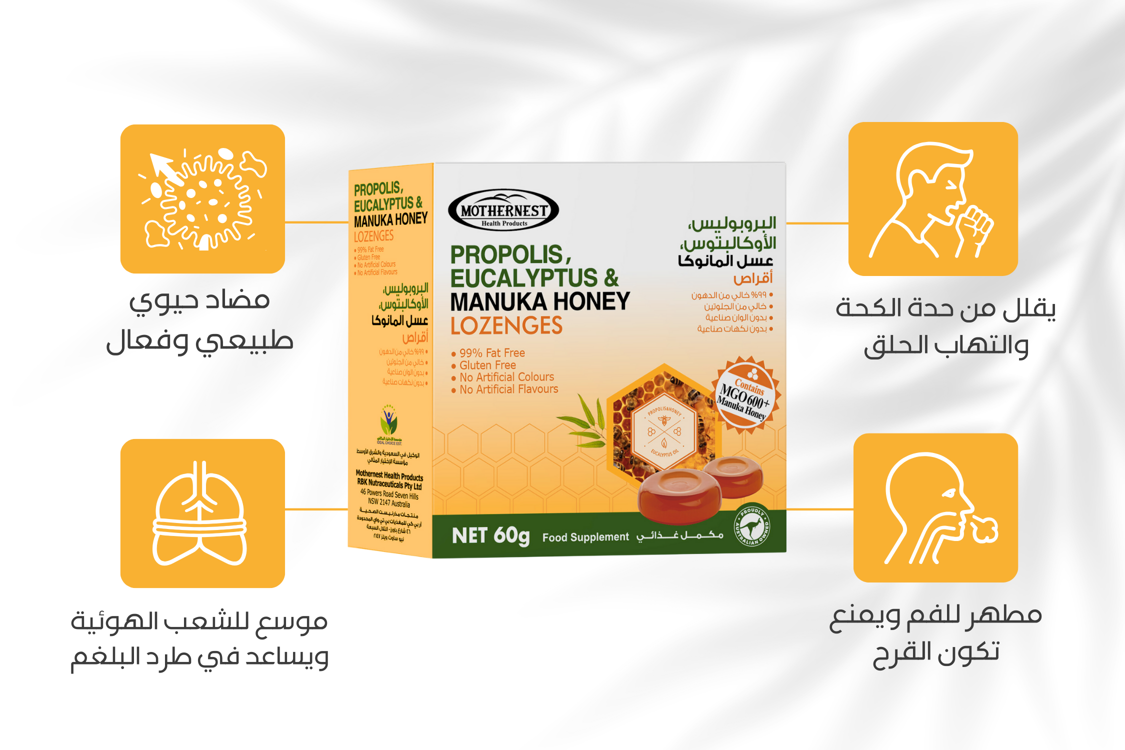 - مذرنيست أقراص الاستحلاب الغني بالبروبوليس أوكاليبتوس مع عسل المانوكا الـأسترالي النقي مضاد حيوي امن وطبيعي لكافة مشاكل الجهاز التنفسي