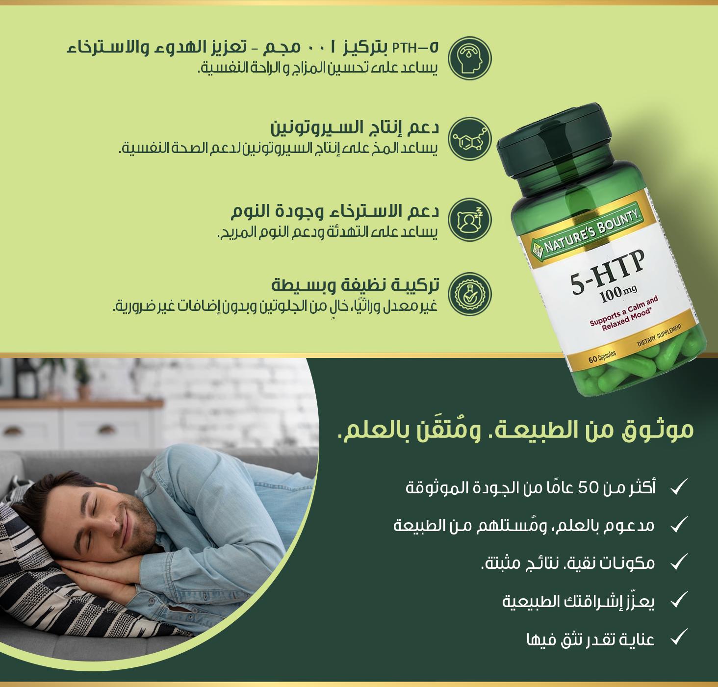 • تدعم كبسولات نيتشرز باونتي 5-HTP 100 مجم إنتاج السيروتونين الطبيعي للمساعدة في الحفاظ على مزاج إيجابي ورفاهية عامة.
