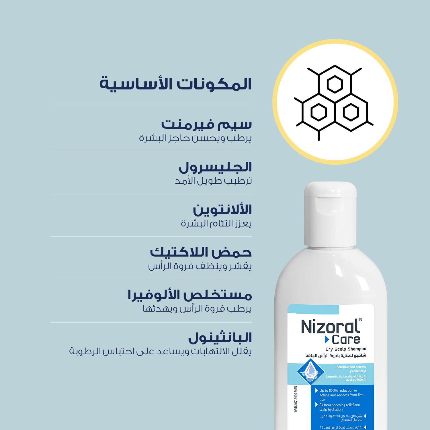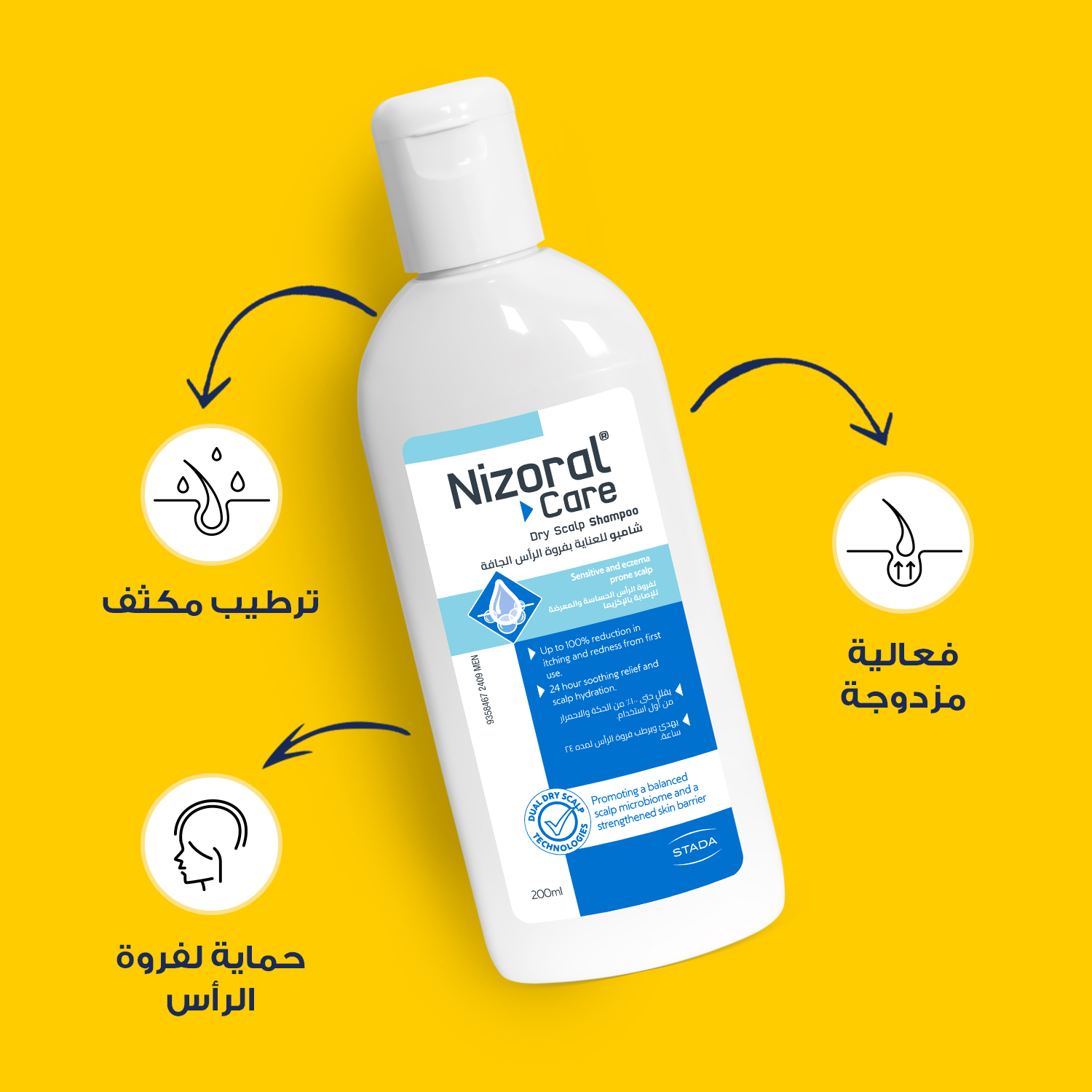 نيزورال شامبو العناية اليومية لفروة الرأس الجافة مصمم خصيصا لتوفير الراحة والترطيب لفروة الرأس الجافة، الحساسة، أو العرضة للاكزيما.