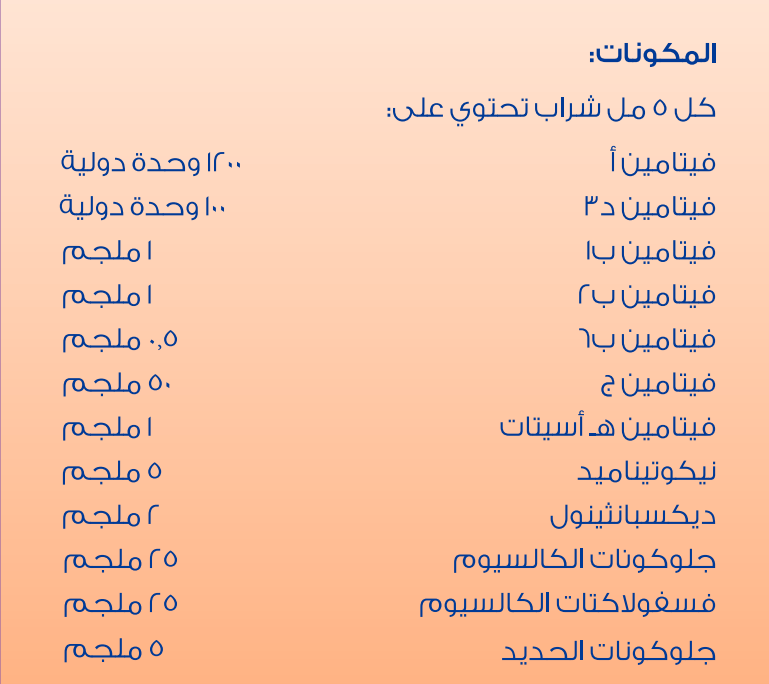 • تدعم الفيتامينات و المعادن النمو الطبيعي لطفلك في فترة نمو اجسادهم كما انها تدعم مناعتهم ضد الامراض و تحافظ على وظائفهم الجسدية و الذهنية و تحميهم من مخاطر نقص الفيتامينات كفقدان الشهية، فقدان الوزن، الشعور بالارهاق، نقص المناعة و مظاهر تأخر النمو.