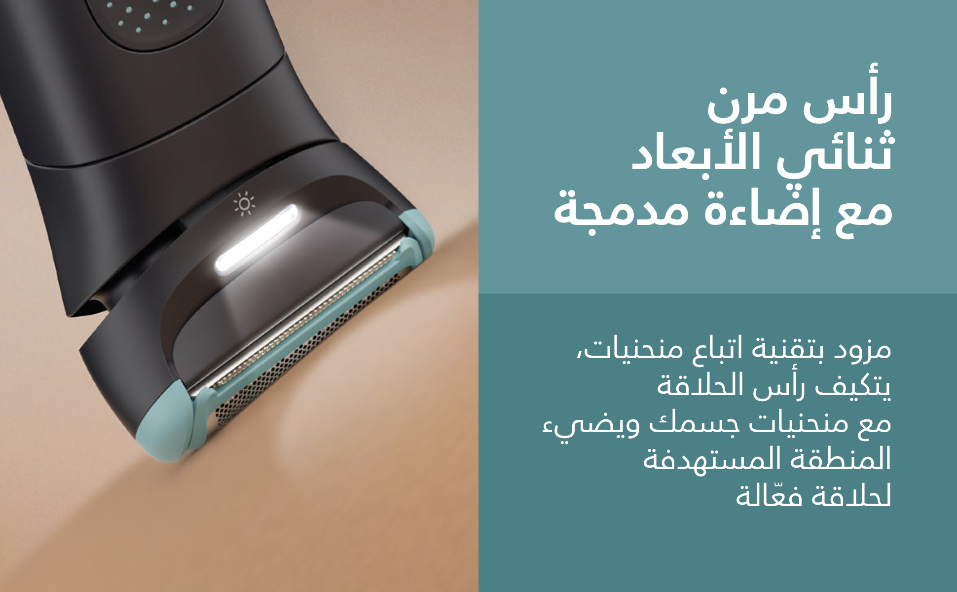 يتكيف الرأس مع منحنيات الجسم بفضل تقنية تتبع الانحناءات، ويضيء المنطقة المستهدفة لتوفير حلاقة دقيقة وفعالة.