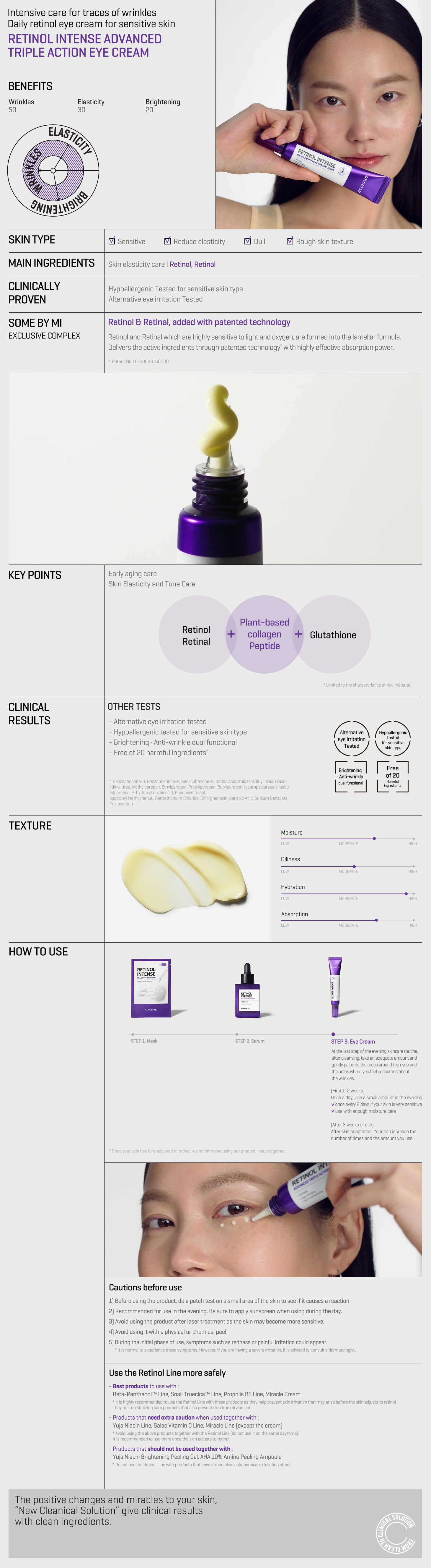 - ماء, جلسيرين, دهون الكابريليك/الكابريك الثلاثية, ثنائي الميثيكون, متعدد السوربات 60, نيكوتيناميد, ميثيل بروبانيديول, كحول سيتيلي, متعدد ميثيل سيلسيسكوكسان, خلاصة نبات سرة الأرض, خلاصة جذور ديسقوريا اليابانية, خلاصة أوراق/جذور/سيقان الكافا (بيبر ميثيستيكوم), خلاصة أوراق شجرة الشاي (ميلاليوكا ألترنيفوليا), خلاصة توت جينسينج باناكس, خلاصة شعريات الشيح, خلاصة جذوع عش الغراب (غانوديرما لوكيدوم), خلاصة الكلوريلا فالجاريس, خلاصة بذور فول الصويا (جلايسن صويا), خلاصة زهور النيلوفر الأبيض (نيمفا ألبا), زيت النخيل (إيليس جوينينسيس), ليسيثن مهدرج, هيالورونات الصوديوم, 1,2-هكسانيديول, ثنائي الميثيكون/فينيل ثنائي الميثيكون كروسبوليمير, بانثينول, بوتيل هيدروكسي تولوين, سيكلوبنتاسيلوكسان, ستيرث 21, بولي إيثيلين جليكول-10 ثنائي الميثيكون/فينيل ثنائي الميثيكون كروسبوليمير, متعدد أكريلاميد, ستيريث-2, إيزوهيكساديكان, كربومير, هيدروكسي أسيتو فينون, أيزوبارافين c13-14, تروميثامين, حمض النخيل, بولي كواترنيوم -51, حمض الشمع, متعدد السوربات 20, ريتينول (0.1%), إيثيل هكسيل الجليسرين, كابريلات الجليسريل, خلات التوكوفيرول, متعدد جليسريل-10 ميريستات, بولي ايثيلين جليكول-30 ثنائي متعدد هيدروكسي ستيرات, هيدروكسي إيثيل سليلوز, جليكوسيل تريهالوز, بيتا-جلوكان, جليسريل عديد ميثاكريلات, لوريث-7, بيوتيلين جليكول, إيديتات ثنائي الصوديوم, هيدروليسات نشاء مهدرجة, أدينوسين, رافينوز, جليسريزات ثنائي البوتاسيوم, ليسيثين, توكوفيرول, جليكول البنتيلين, حمض بيتا هيدروكسي, حمض الميرستيك, بروبانيديول, جليكول ثنائي البروبيلين, فوسفات ثنائي الصوديوم, جليكول كابريليل, كولاجين, حمض مديكاسيك, صمغ سكريات حيوية-1, أسياتيكوسيد, صوديوم بالميتويل البرولين, ترشيح تخمر جذور الفجل/لوكونوستوك, حمض أسياتك, جلوتاثيون, ريتينال, ماديكاسوسيد, فوسفات الصوديوم, أسيتيل سداسي البيبتيد-8, أمونيوم أكريلويد الديميثيل تورات/في بي كوبوليمر, رباعي البيبرين المائي, فلوريتين, أرجينين, عطر.