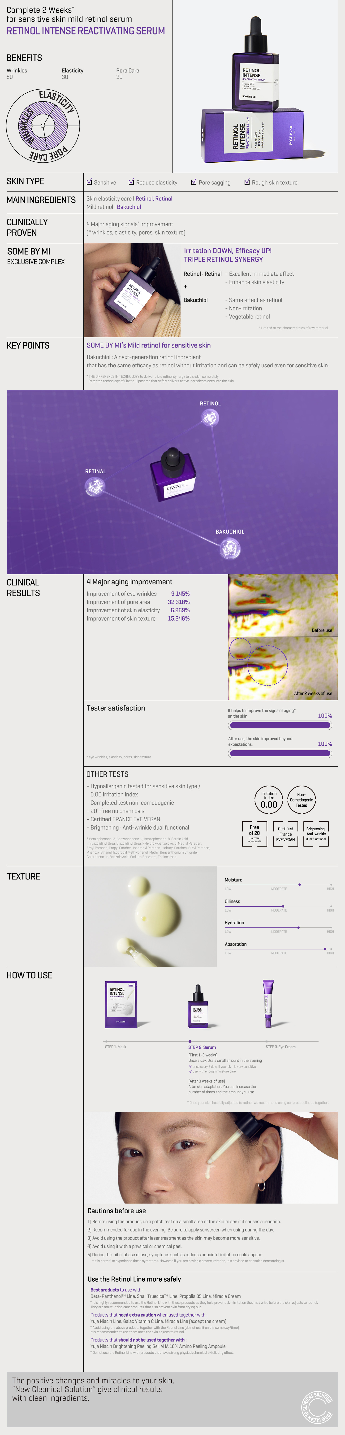- لطيف على البشرة ومناسب لاصحاب البشرة الحساسة. معزز بخليط مركبات الريتينول، الريتينال، والباكوتشيول لتعزيز مرونة البشرة والعناية بالخطوط الدقيقة والتجاعيد بدون التسبب بتهيج البشرة.