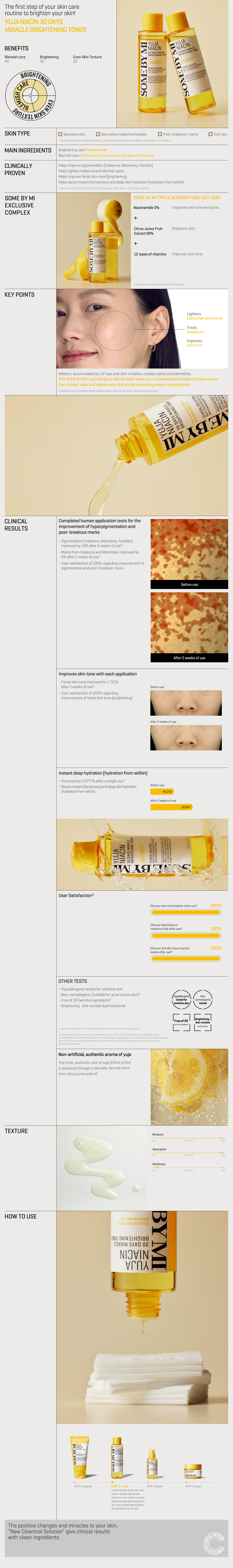 - تونر معزز بقوة الحمضيات لاحتوائه على فاكهة اليوجا الكورية (90%) ومركب النياسيناميد (5%). يمنح البشرة كمية كبيرة من فيتامين سي مما يساعد على تفتيح البشرة ومنحها إشراقة مثالية وصحية.