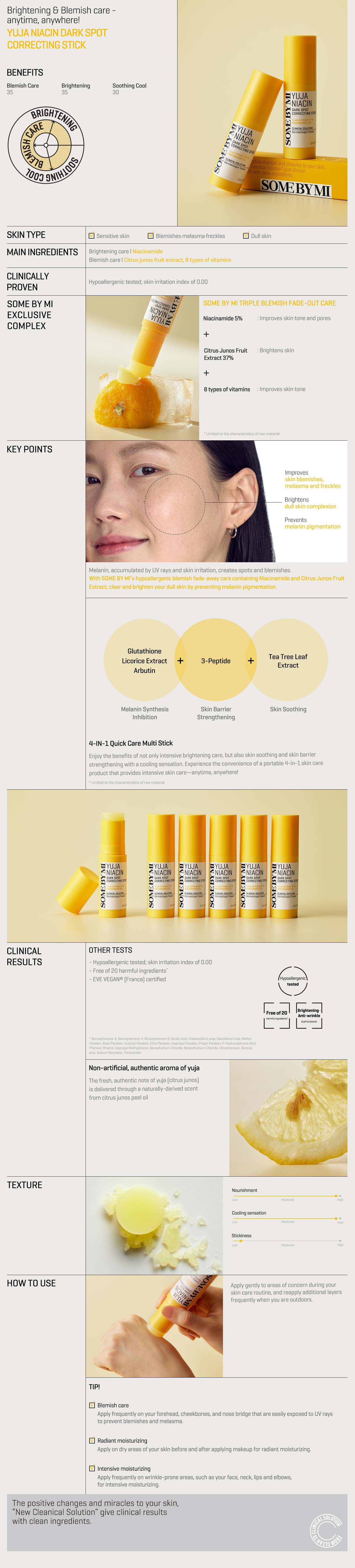 - يحتوي على مركبات الأربوتين، الجلوتاثيون، والالنتونين المفتحة والمرطبة للبشرة. يمنح البشرة إشراقة ومظهر حيوي بمجرد مسح الستيك على البشرة.