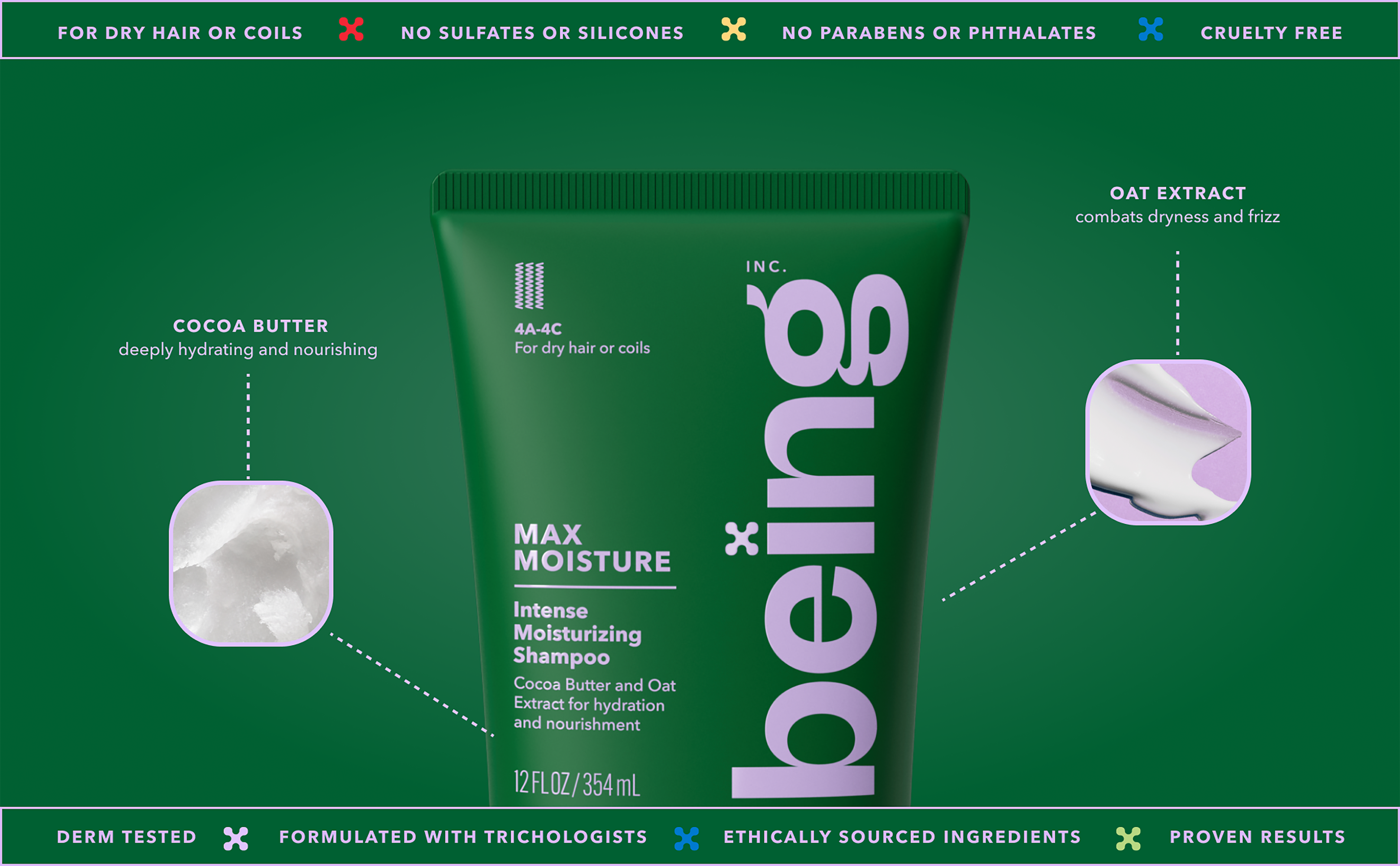 Being MAX MOISTURE Intense Moisturising Shampoo is for hair in need of an intense hydration boost, whether coily (type 4A-4C) or otherwise dry. This dermatologically tested, sulfate-free and silicone-free formula contains naturally derived ingredients such as Cocoa Butter and Oat Extract to combat dryness, providing a supportive wash to hair in need of deep nourishment.