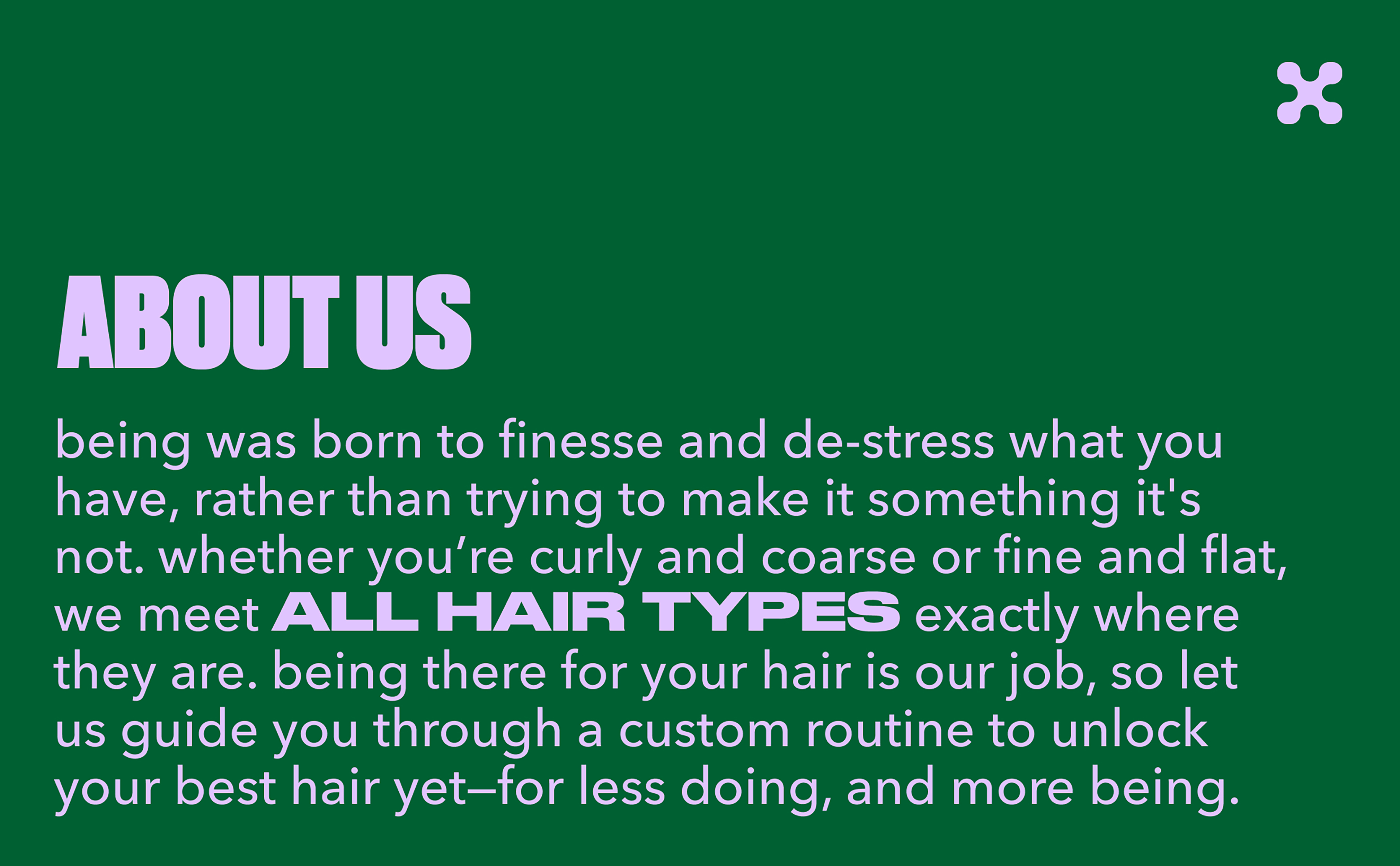 Being is a community-led hair care brand created to meet all hair types exactly where they are. The range works to finesse and de-stress what you have, rather than trying to turn it into something it's not. Whether you’re curly + coarse or fine + flat, help unlock hair that makes you feel more you—for less doing and more Being.