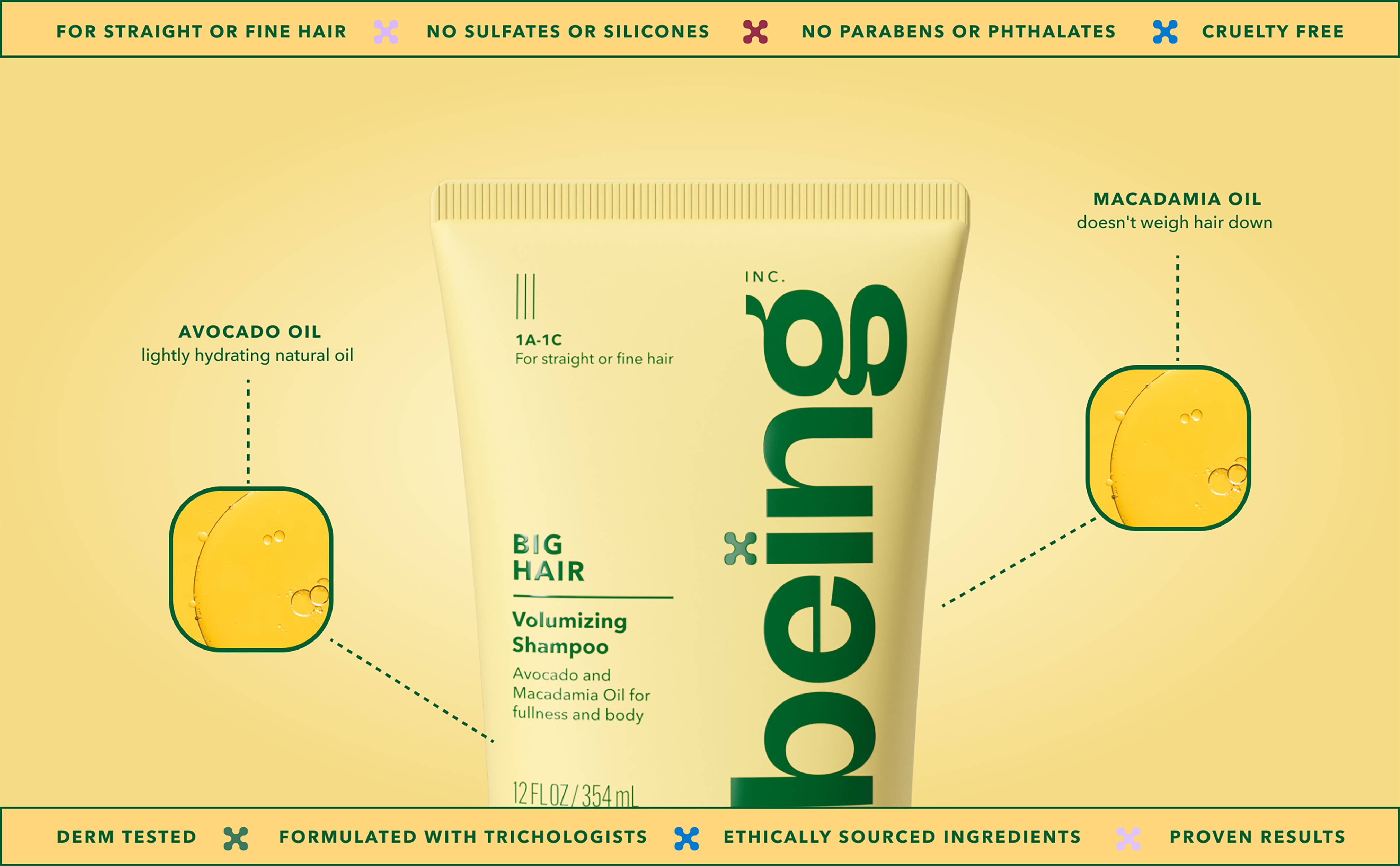 Being BIG HAIR Volumising Shampoo is ideal for type 1A-1C hair, including those with straight and/or thin and fine hair who are looking for more fullness and body. This dermatologically tested, sulfate-free and silicone-free formula contains naturally derived ingredients such as Avocado Oil and Macadamia Oil for a thorough, clarifying wash. Hair is left feeling balanced, plump and full of body. Being is a community-led hair care brand created to meet all hair types exactly where they are. The range works to finesse and de-stress what you have, rather than trying to turn it into something it's not. Whether you’re curly + coarse or fine + flat, help unlock hair that makes you feel more you—for less doing and more Being.