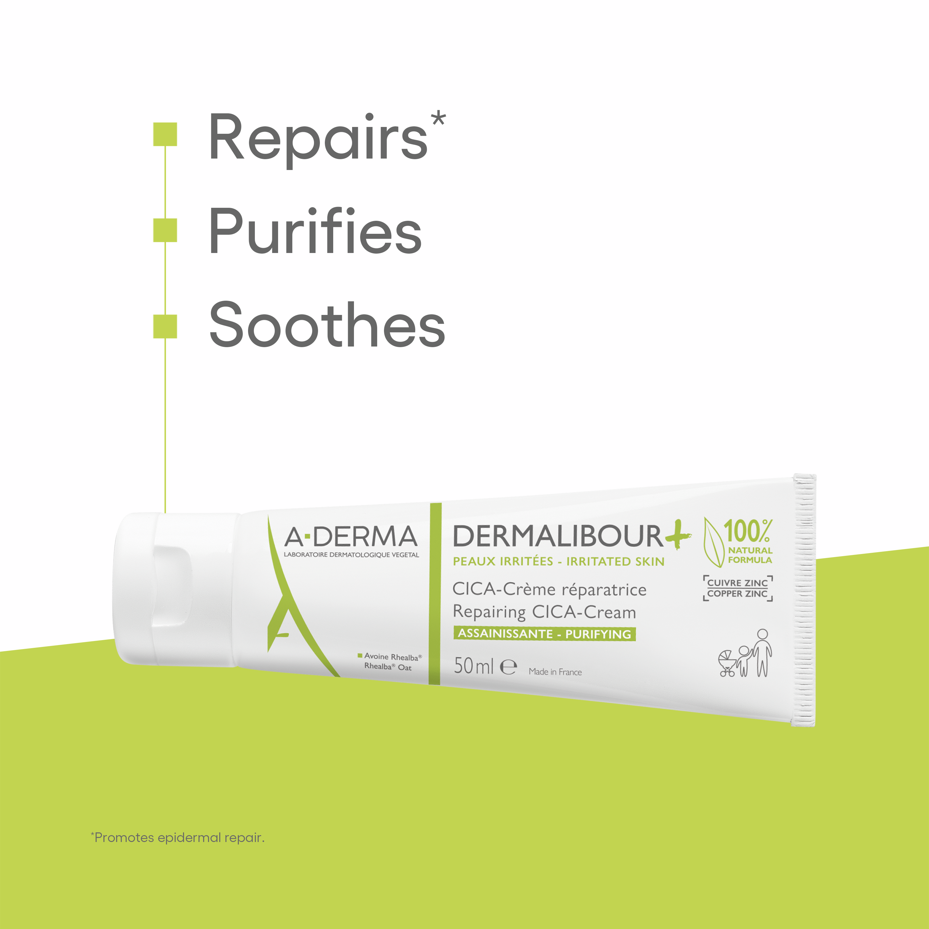 It soothes and promotes the epidermal repair of irritated and fragile skin. Indispensable for taking care of small everyday scrapes and scratches; in other words, when “it's red, itches or stings.” It contains 2% more glycerin for extra comfort and protection, with a smoother non-occlusive texture. Helps the epidermal repair of skin in 4 days.