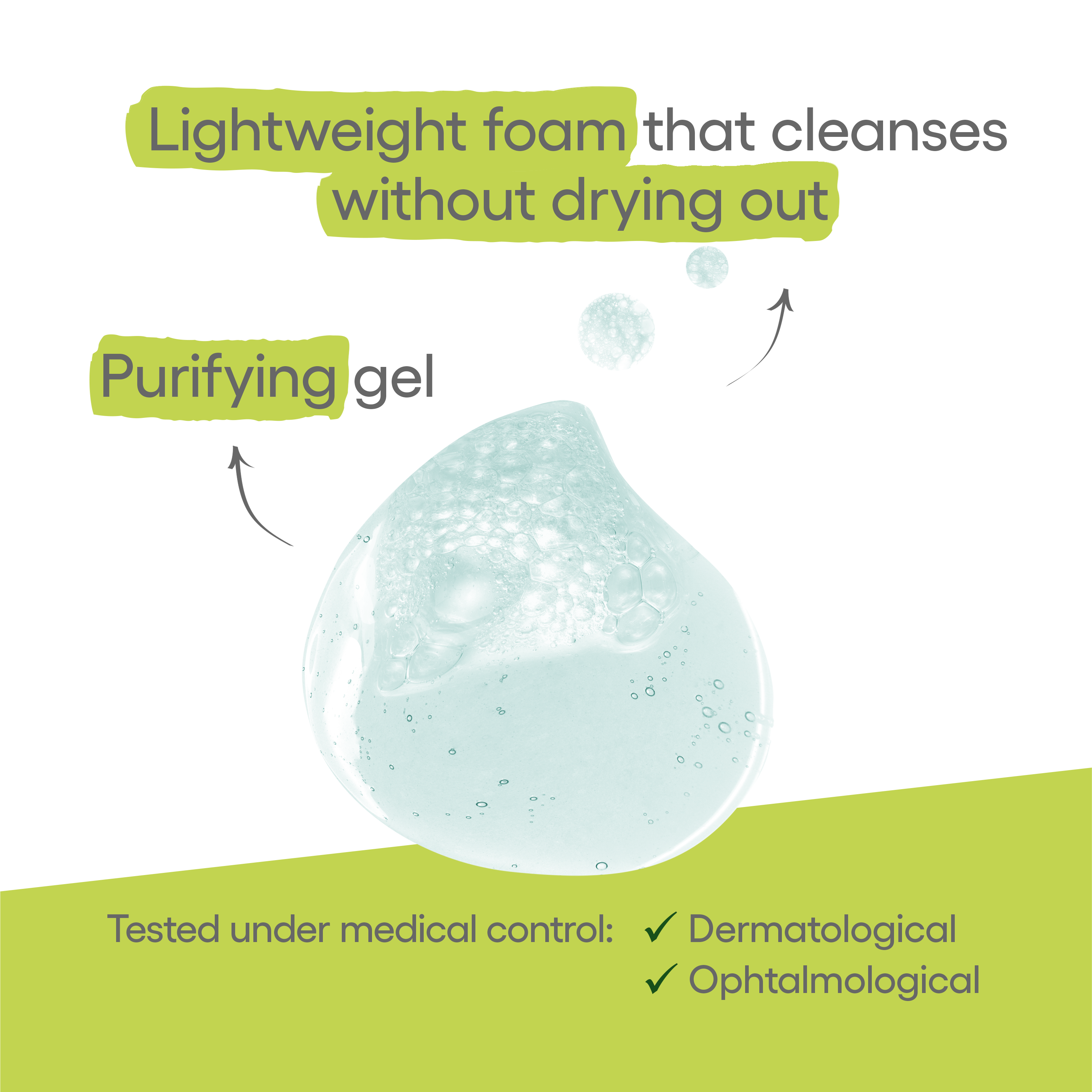 It gently cleanses and purifies acne-prone skin without drying it out. Ultra-fluid, lightly foamy texture that rinses off quickly. Use to obtain soft, fresh, matte skin that isn’t dried out. This product doesn’t contain soap since acne-prone skin is already unbalanced.