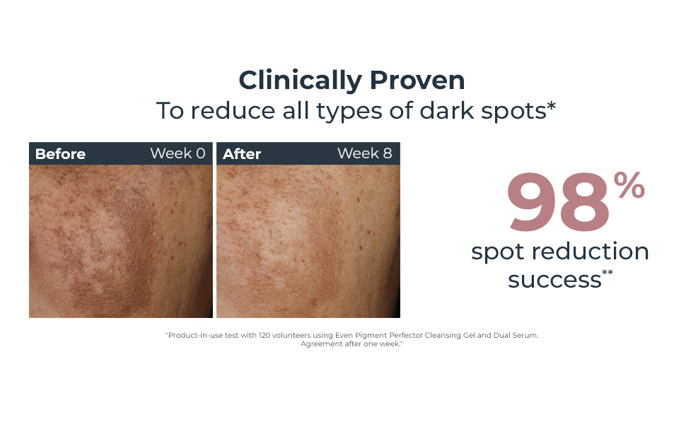 - Our Even Pigment Perfector Cleansing Gel, with lactic acid and glycolic acid that exfoliate dead skin cells for a renewed looking skin.