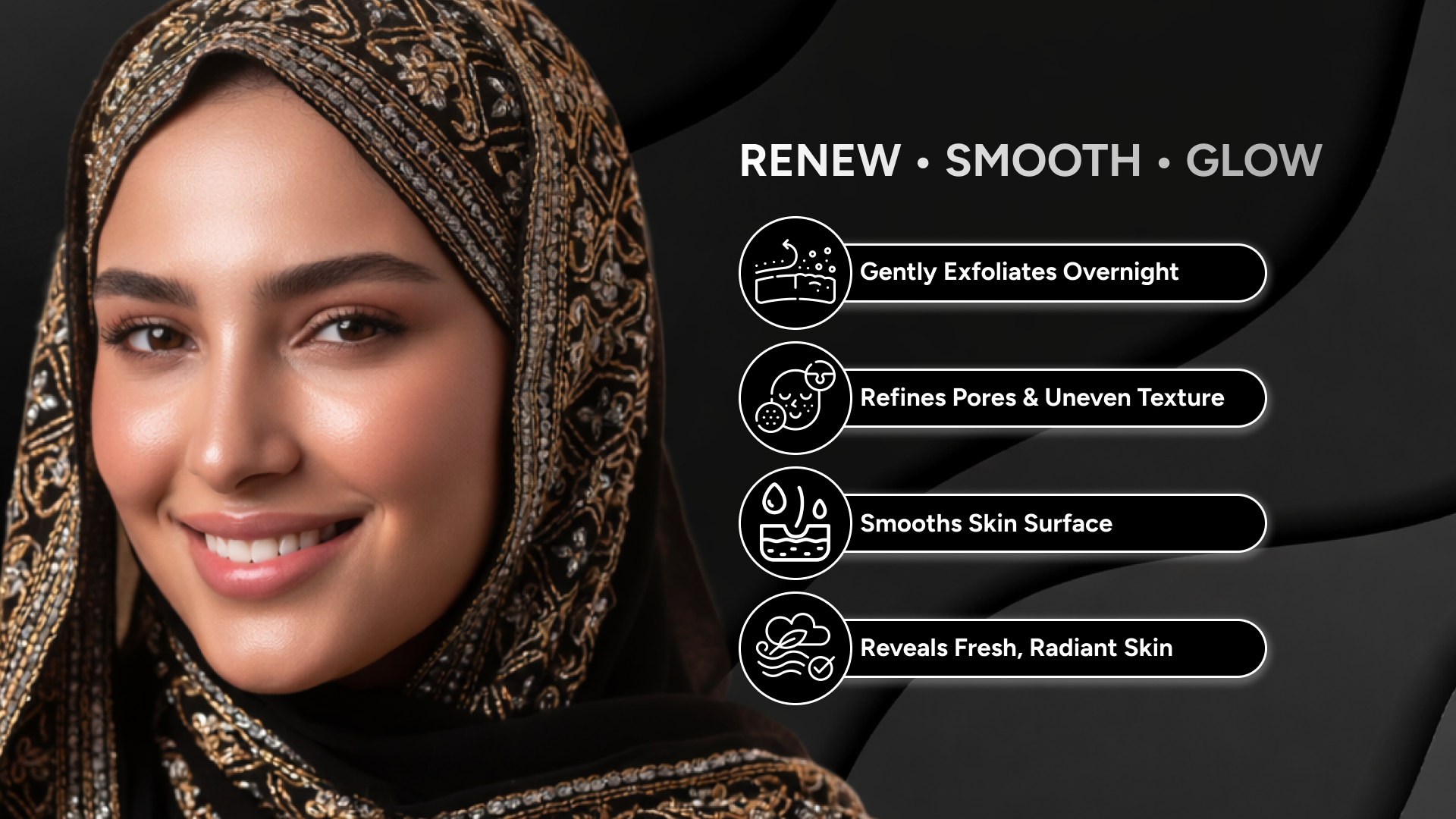 - Skin issues: fine lines and wrinkles, dullness, uneven skin tone, rough texture;