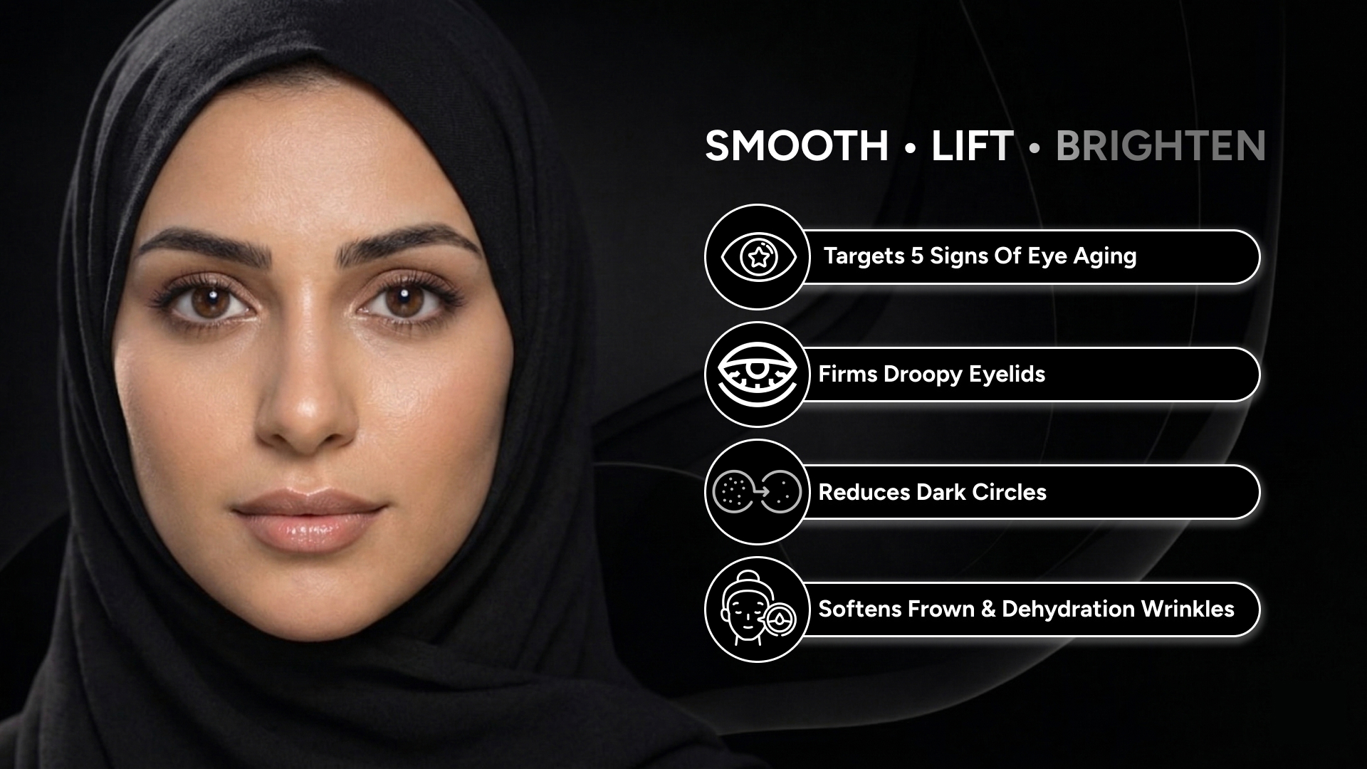 - Reduction of all types of under-eye concerns, such as hollows and dark circles