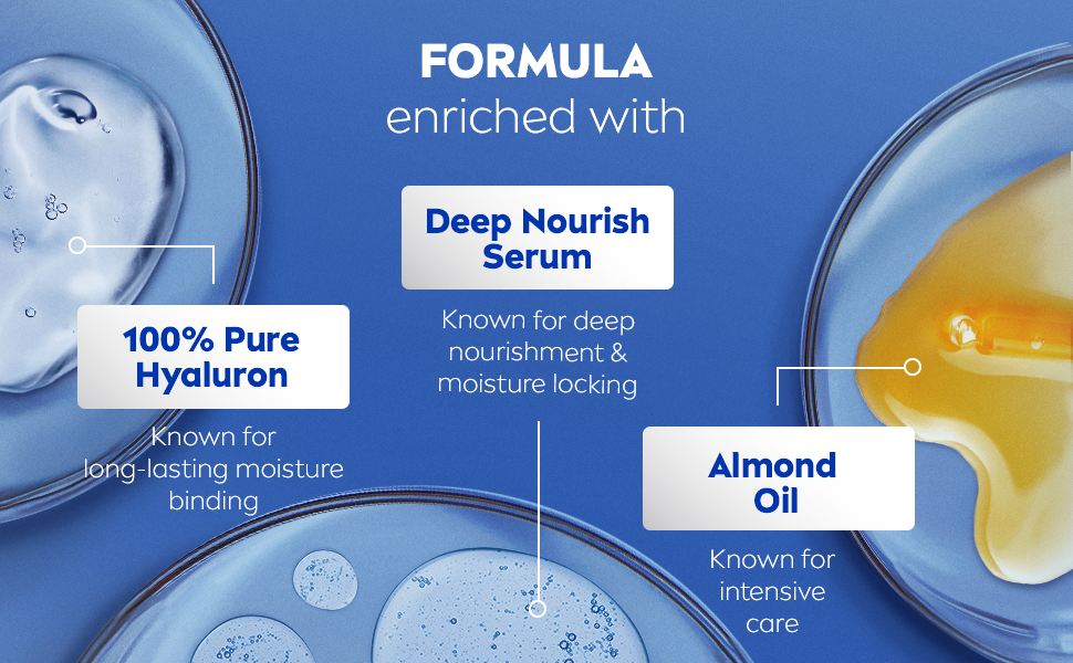 - ENRICHED WITH A UNIQUE FORMULA: Infused with Pure Hyaluron and moisturizing ingredients like Almond Oil, Deep Nourish Serum and Vitamin E, this body cream provides deep nourishment and intensive care, making it perfect for the whole family.