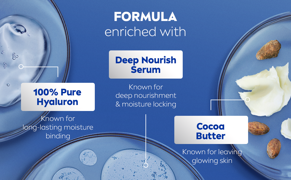 - Enriched with 100% Pure Hyaluron, Deep Nourish Serum, Cocoa Butter and Vitamin E, this body moisturizer offers complete care: (1) 48H deep moisturizing effect, (2) dry-out protection (3) smooth skin feel (4) beautiful glow (5) healthy-looking skin.
