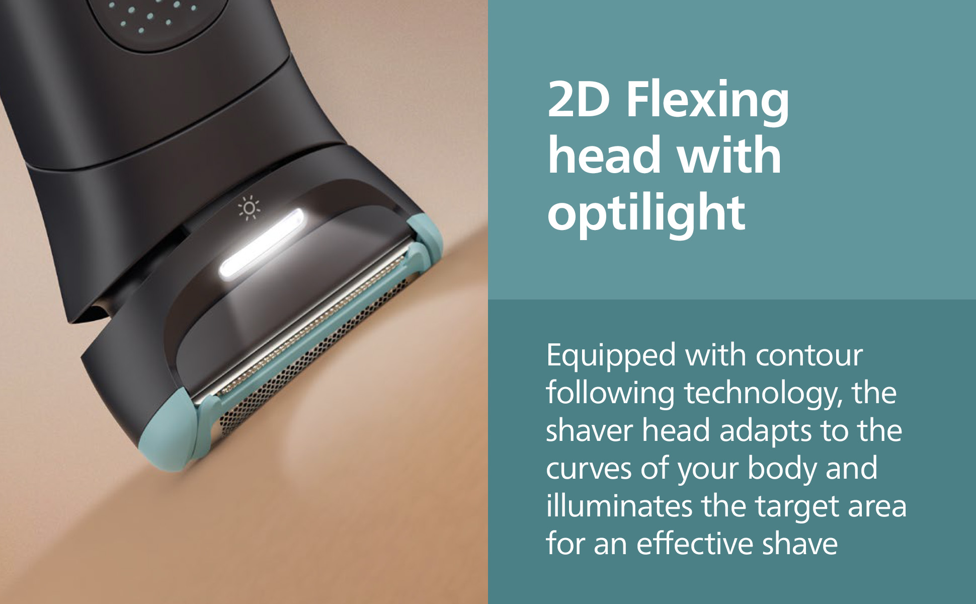 2D flexing shaver head with Optilight: with contour-following technology, the shaver head adapts to the curves of your body and illuminates the target area for an effective shave​