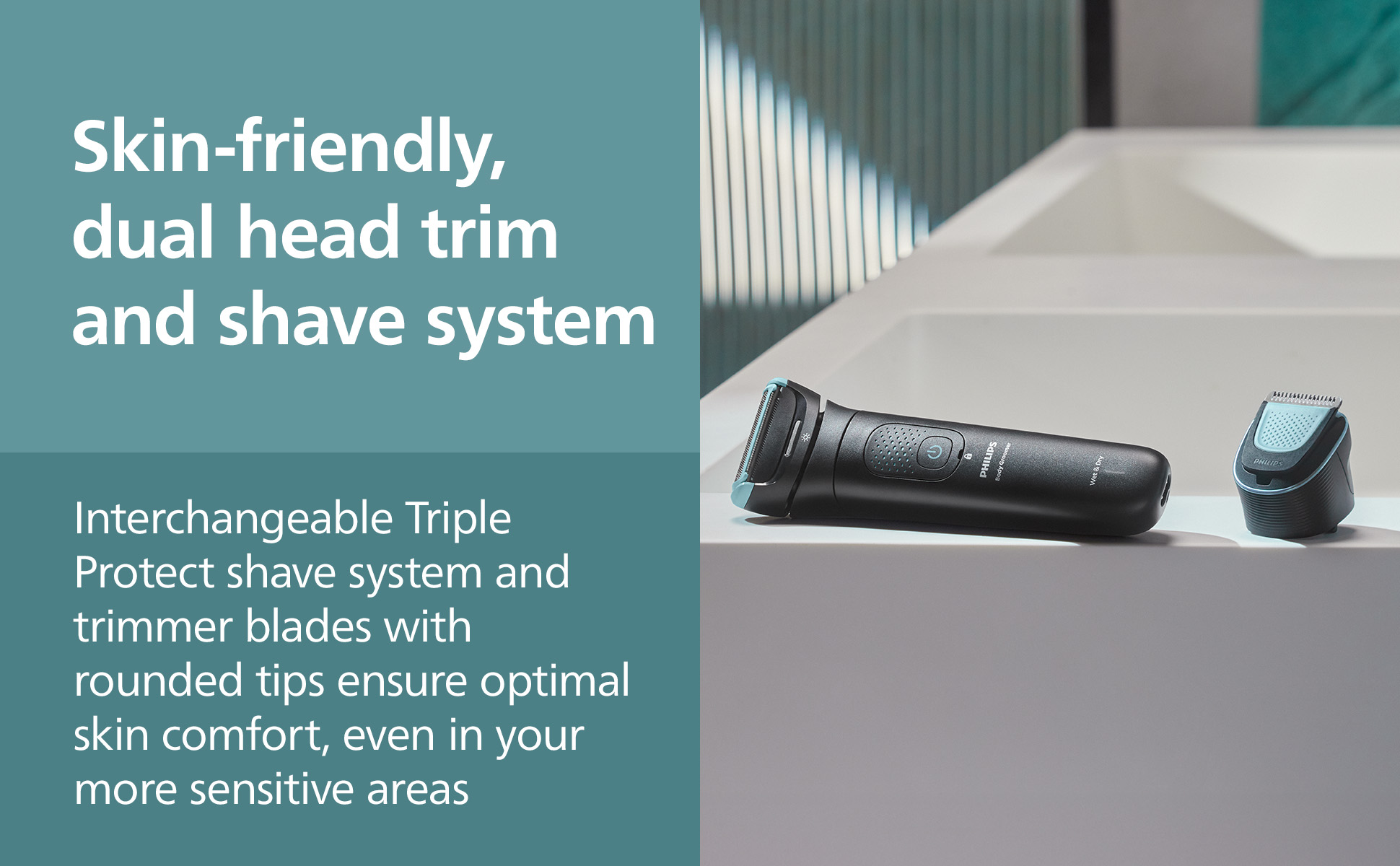 Interchangeable Triple Protect shave system and trimmer blades with rounded tips ensure optimal skin comfort, no matter your grooming needs​