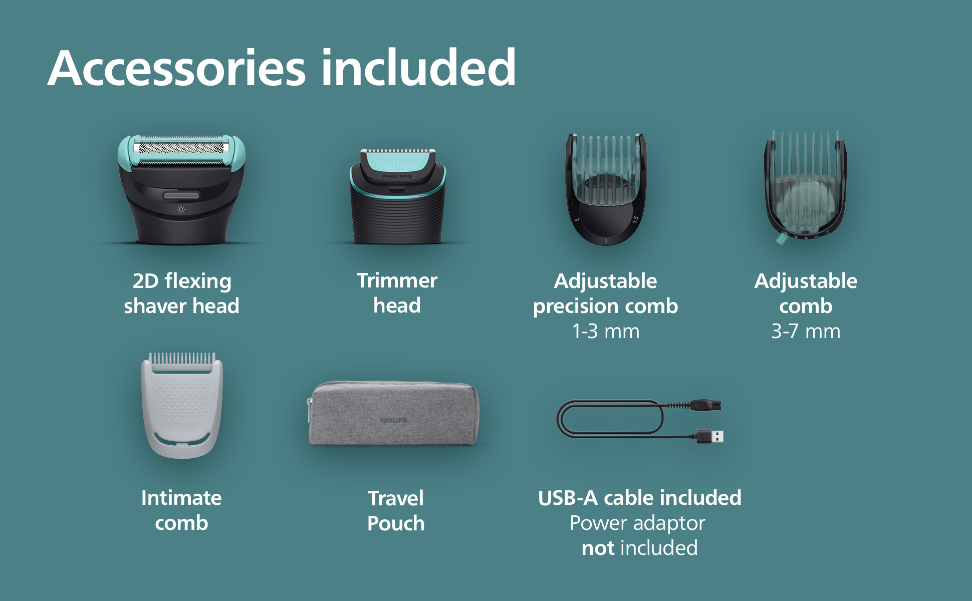 The set includes: 1x Philips Body Groomer 7000 Series, 1x 2D flexing head with Triple Protect shave system, 1x skin-friendly trimmer head, 1x back attachment, 1x intimate comb, 1x adjustable precision comb 1-3 mm, 1x adjustable comb 3-7 mm, USB-A cable (power adapter not included).​