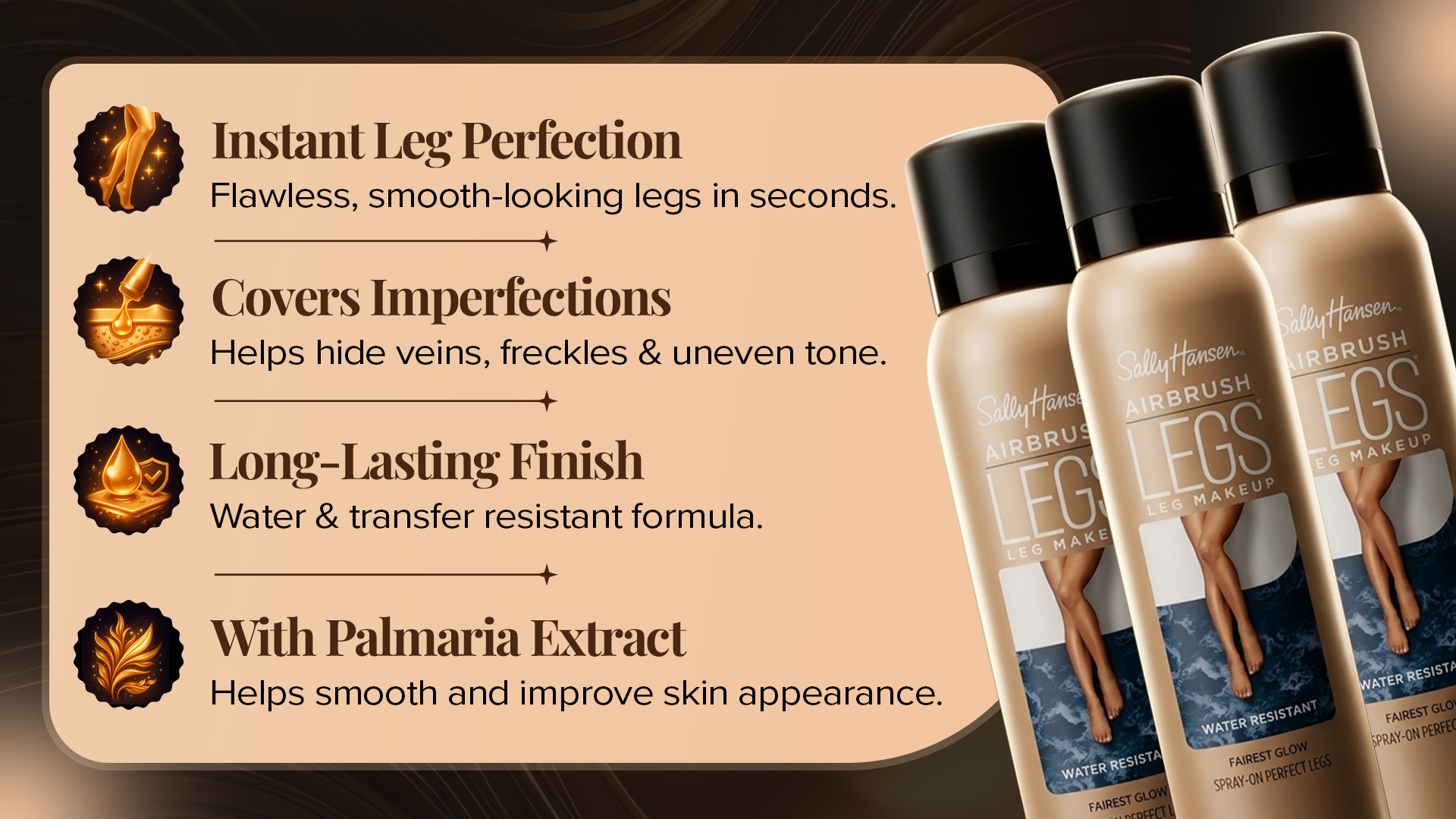 - A leg makeup lotion that covers freckles, veins, and imperfections with a fresh, airbrushed look.