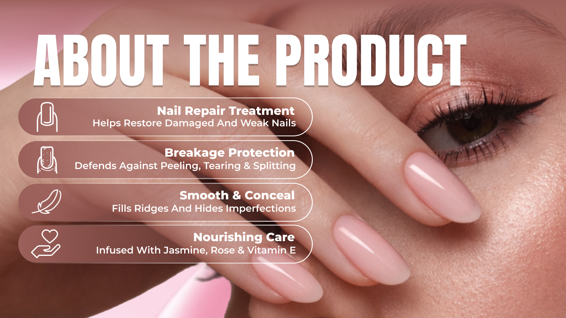 - An innovative nail treatment for damaged nails that helps strengthen weak nails and repair ravaged nails. Strengthening, sheer pink formula, with Jasmine & Rose extracts, instantly fills in ridges & conceals damage. This nail strengthener works as an effective nail repair treatment for brittle and peeling nails.